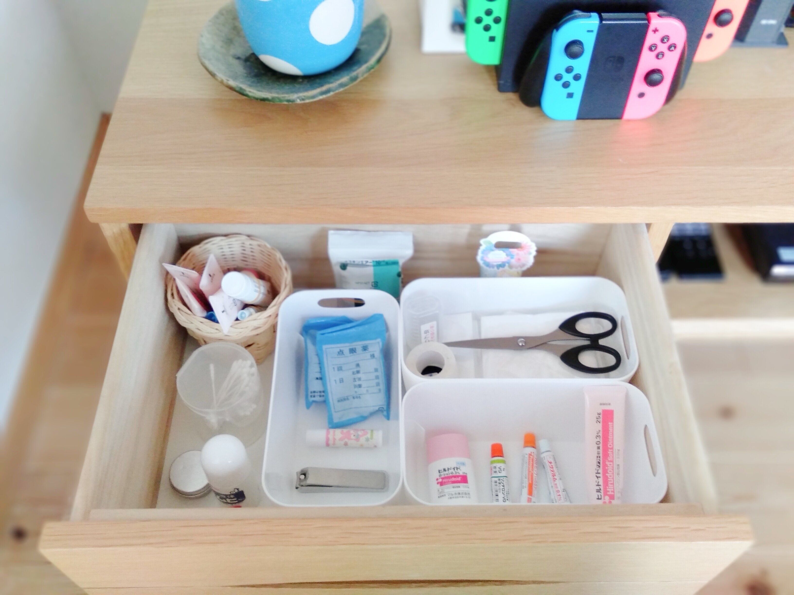 爪切りや薬類はテレビボードの左側の引き出しに。