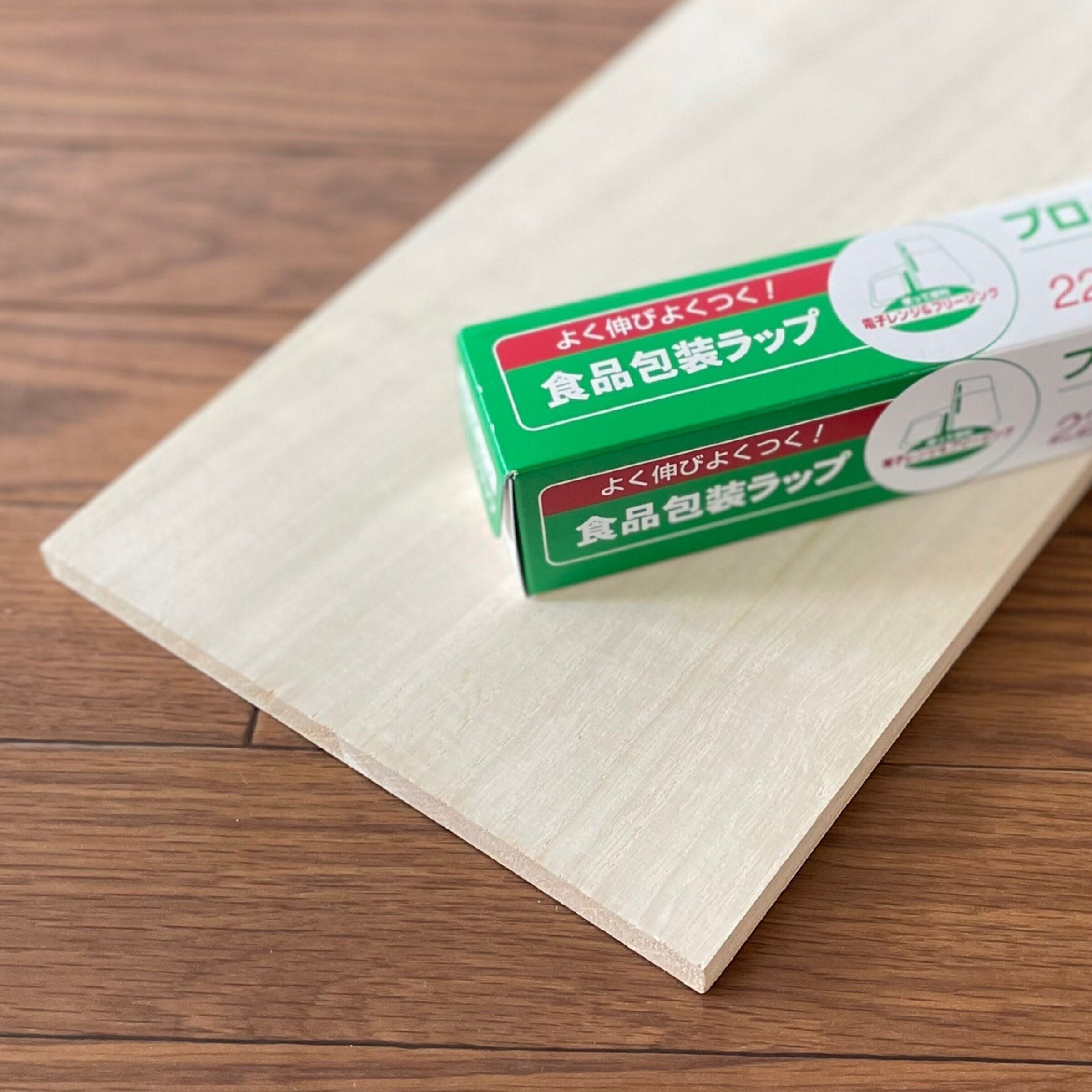さらに、板だけでは洗面所の水がかかって染みたり汚れてしまうので食品用ラップフィルムを巻きつけます。これを防水パンの隙間に設置すれば出来上がりです。