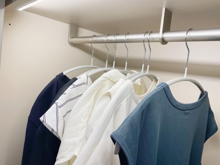 KEYUCAのハンガーは厚みもなく薄いため服を掛けて収納した時、クローゼットの中がパンパンにならずスッキリした見た目になるのもオススメする理由です。ハンガーの色がグレーと主張しすぎないカラーなのも気に入っています。