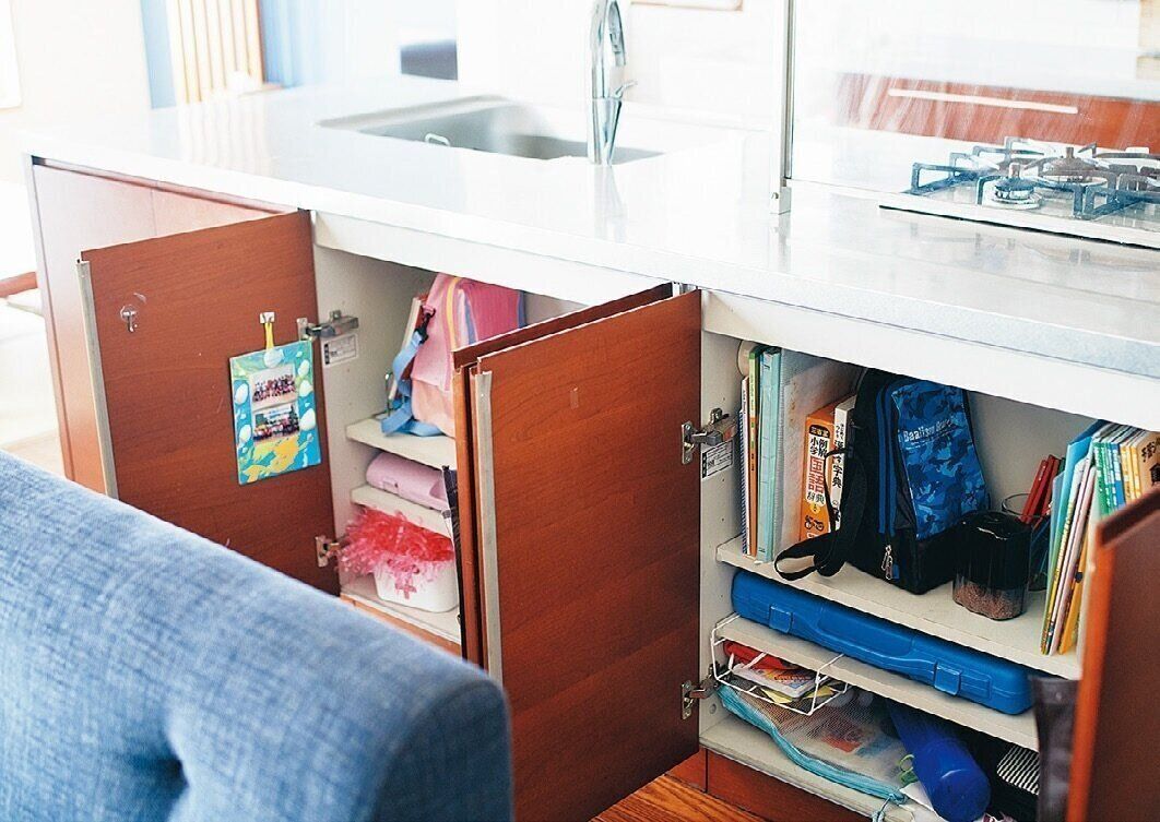 ダイニングに置いてもOKの子どもの物を厳選。「『ここに入る分だけ』が決まり。学期ごとにチェックして捨てられる物を見つけます」。
