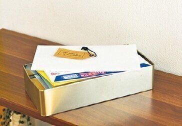 郵便物は、玄関に近い棚の上にバラバラ置いてしまいがち。ブリキ缶を置いて指定席にしたら、すぐ必要な郵便物が行方不明になる失敗もゼロに!