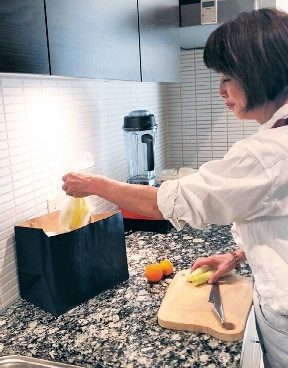 「食材を切りながら皮や根をポリ袋に入れ、作業を終えたら、ポリ袋の口を縛って紙袋の中へ。水けやにおいが防げます。最後は、ほかのゴミと一緒に大きめのゴミ袋に入れて※出します」。