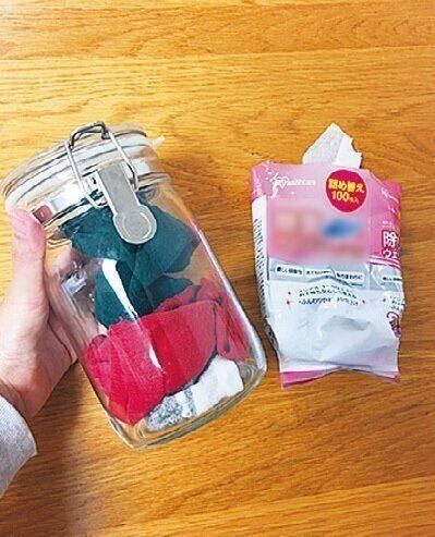 穴があいた靴下をカットしてびんの中に。「どうせ捨てる物だから」と思うと、どんどん汚れ落としに使えて、小まめに掃除するようになりました。