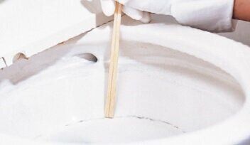 便器の黒ずみをこすり落とす。