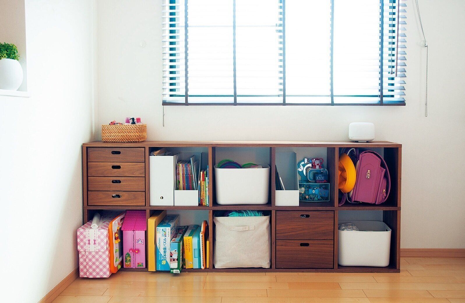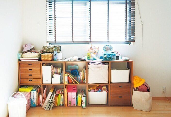 「子どものおもちゃをムリに捨てる必要はなく、捨てる量は少なくてもいいんです」と鎌田さん。一部のおもちゃは別の場所へ移動し、ランドセルと学用品置き場が棚の右上に完成。
