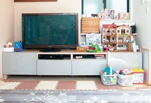 ソファまわりにおもちゃが散乱してくつろぐスペースなし。テレビボードの上はカラフルなおもちゃがいっぱいで落ち着いて番組が見られません……。