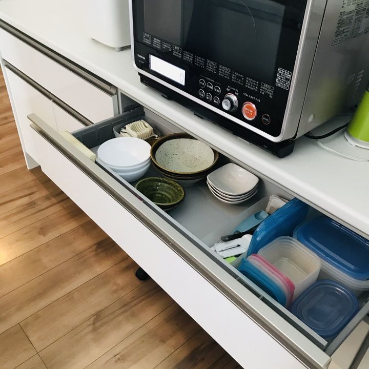 我が家では料理を盛り付ける時に、サッと食器を取り出せるように、調理スペースの後ろにある食器棚の引き出しに一番よく使う食器を収納しています。皆さんも「一番よく使う食器は何か?」使用頻度を考えて食器を収納してくださいね。