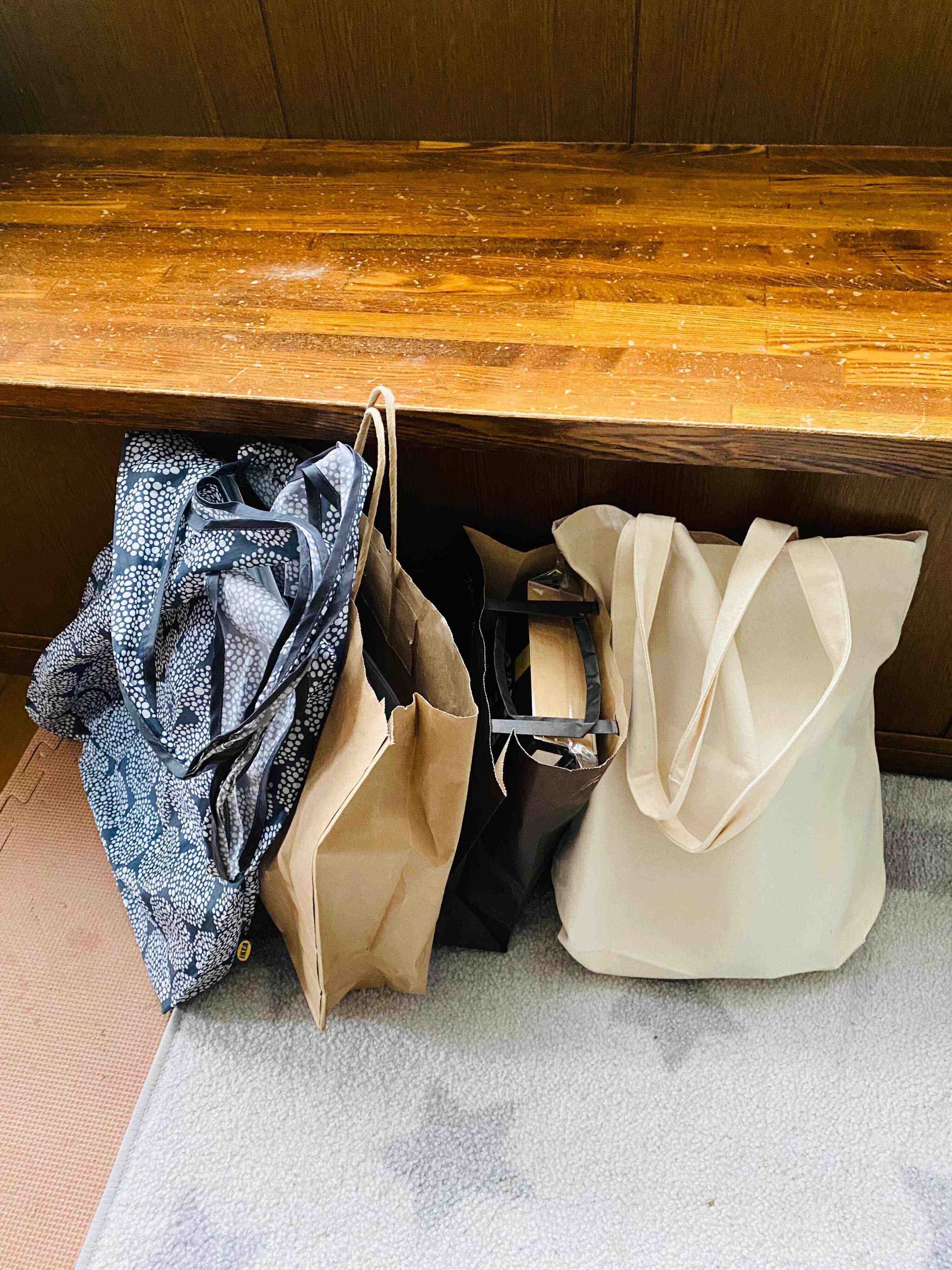 全体的に家の中のモノが多いお宅でよくある現象なのですが、部屋のあちこちに紙袋やエコバッグがいくつも並んで置かれていることがよくあります。
