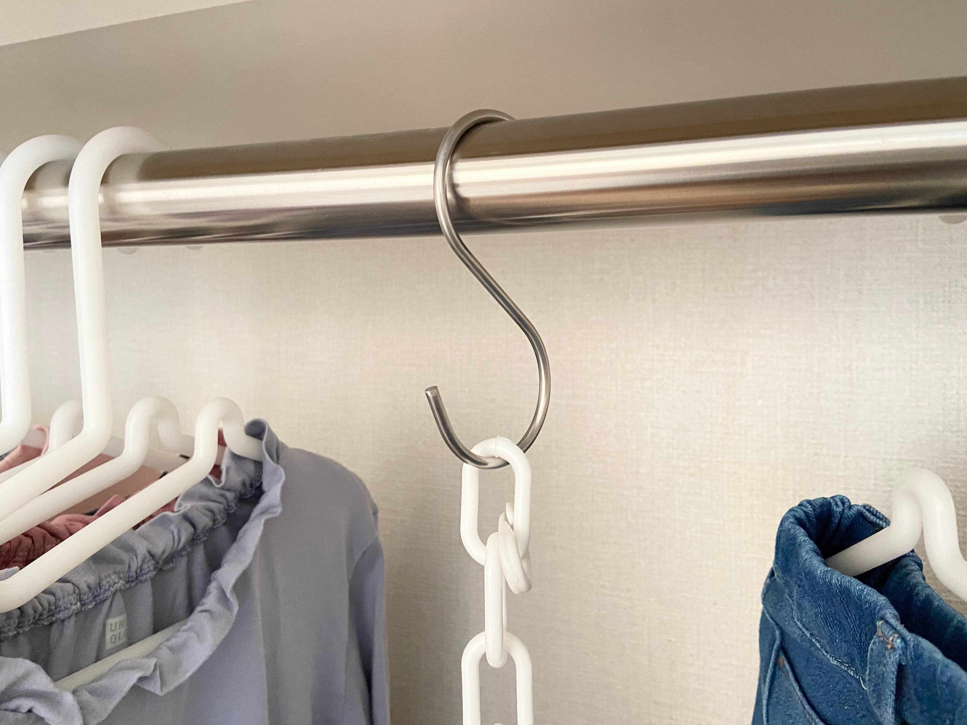 クローゼットの中のブランコ収納に使っているのがセリアのS字フックとジョイントつきプラスチックチェーン太。子どもの身長と衣服の大きさにあわせてチェーンの長さを調整して使えるので便利です。