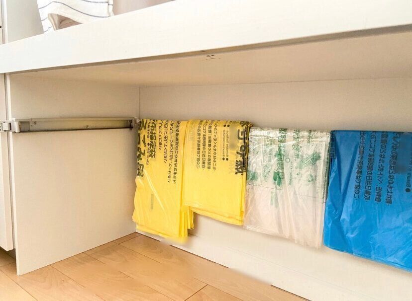 「つっぱり棒」でゴミ袋をかけておくだけの簡単収納で、ゴミ箱の袋替えがとってもスムーズになりました。