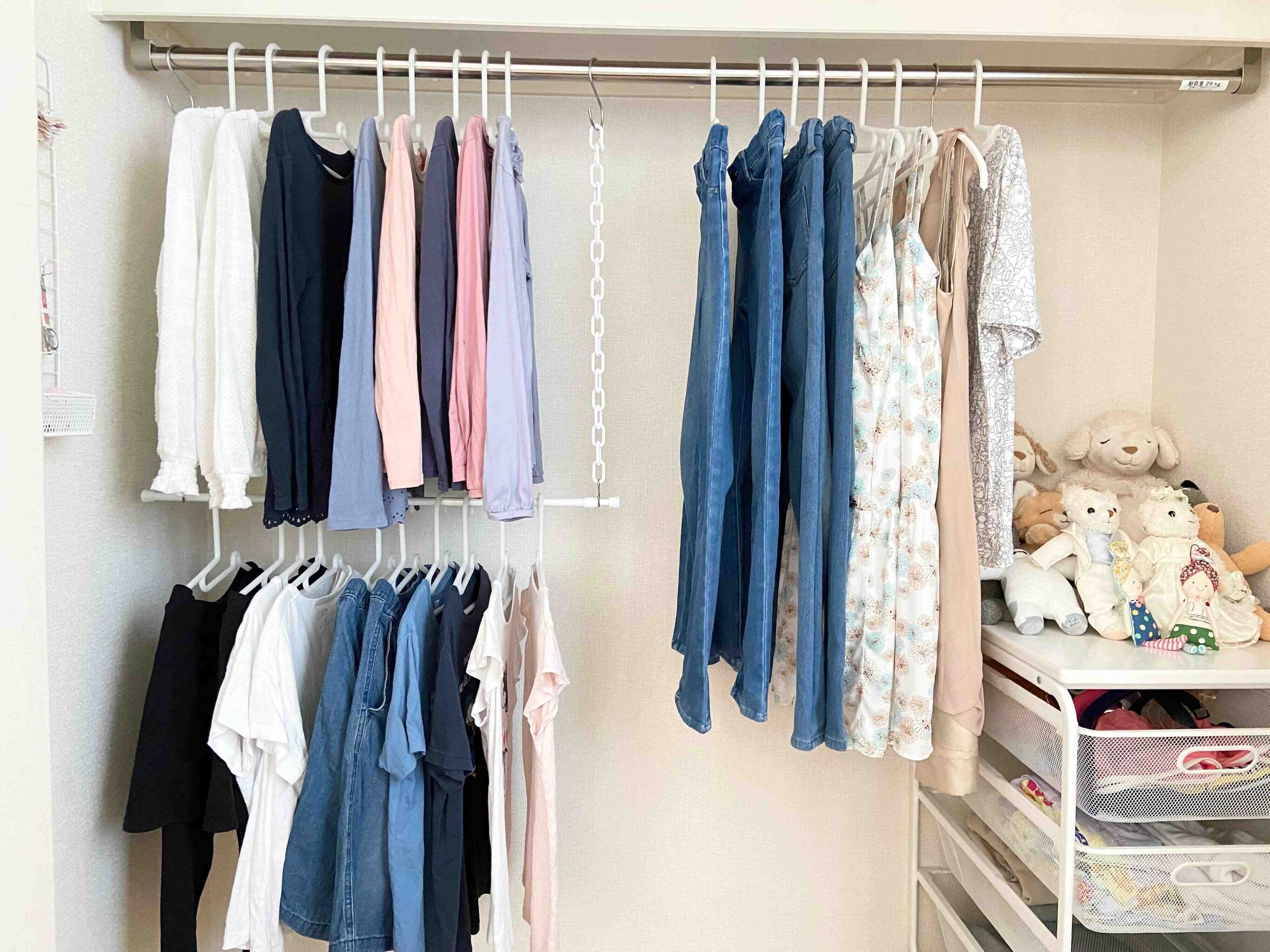 最近では身長が高くなってきてブランコ収納では裾がずってしまう衣服も出てきたので、「つっぱり棒」の長さを短くしてワンピースや長ズボンと半ズボンやTシャツ類とで分類収納するのにも一役買っています。