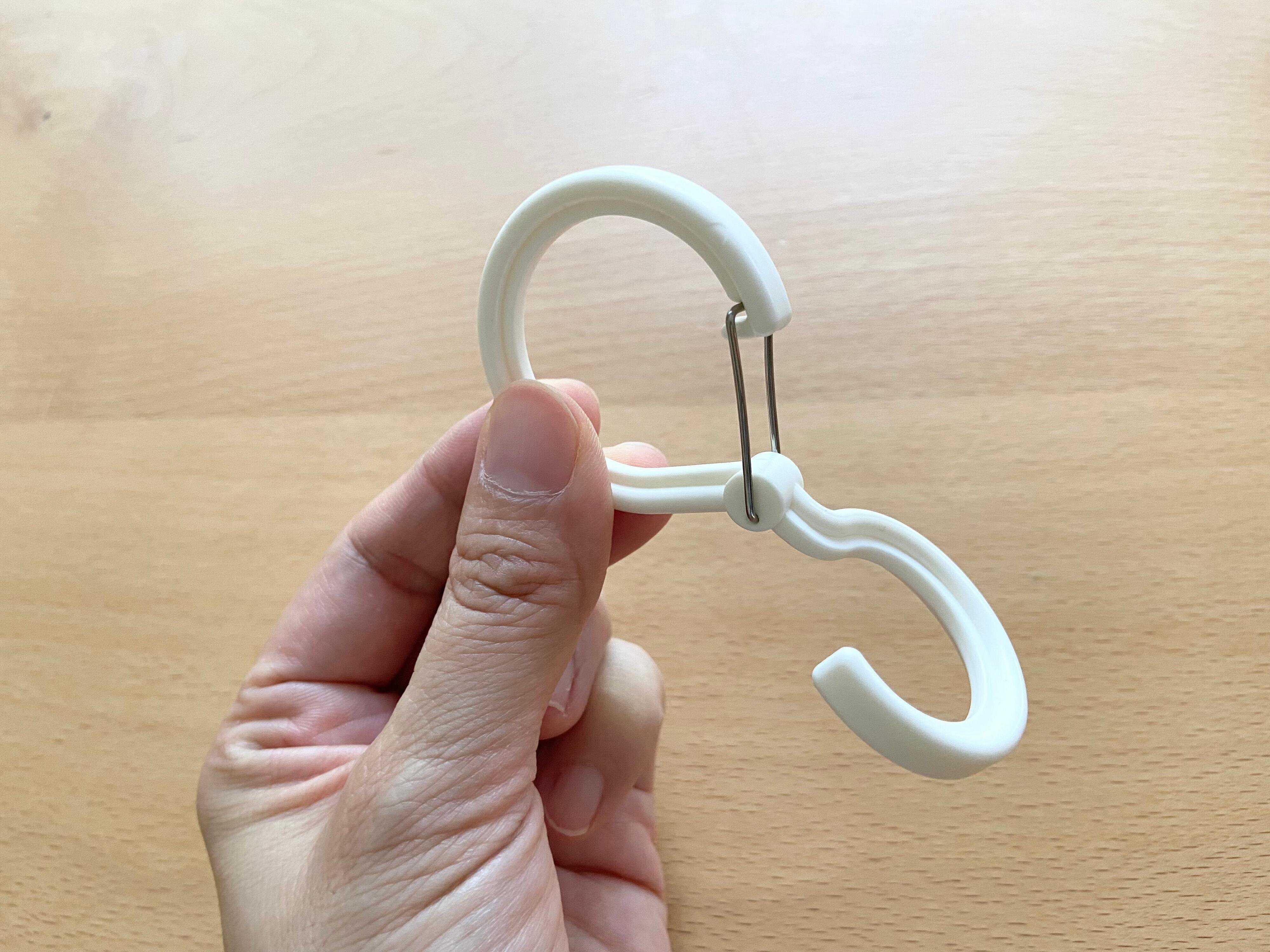 鞄収納に「つっぱり棒」と組み合わせてると便利なのがセリアのストッパーつきフック(ねじれ)。通常のS字フックだと取り外しの際に落下する可能性がありますが、ストッパーつきなので外れず90度違う向きにものが吊れてとっても使えるアイテムです。