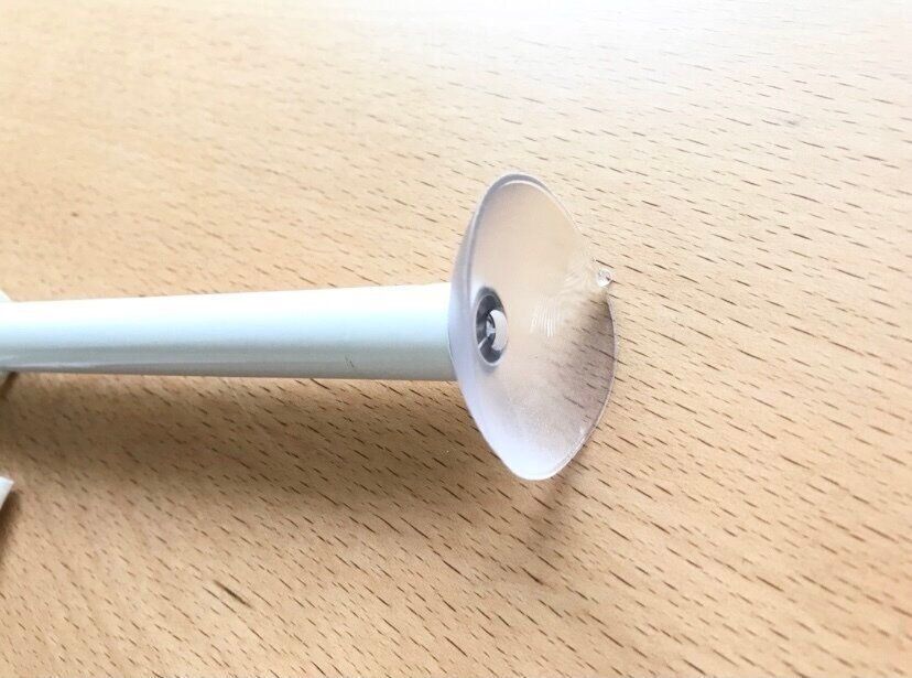 つっぱり棒収納で一番ネックになるのが落下問題。いろいろな落下防止アイテムが発売されているので試してみましたが、一番落下率が低くて取り入れているのが端を吸着盤に変える方法。複数入りで100円ショップで購入できるアイテムです。