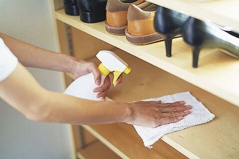 外から持ち込まれた汚れがカビの発生原因とならないように、靴の裏や靴箱にエタノールをスプレーします。ただし、エタノールには油分を分解する性質があり、木製の靴箱や革製の靴を変色させることがあります。初めて使う際は、目立たないところで試してからにしましょう。