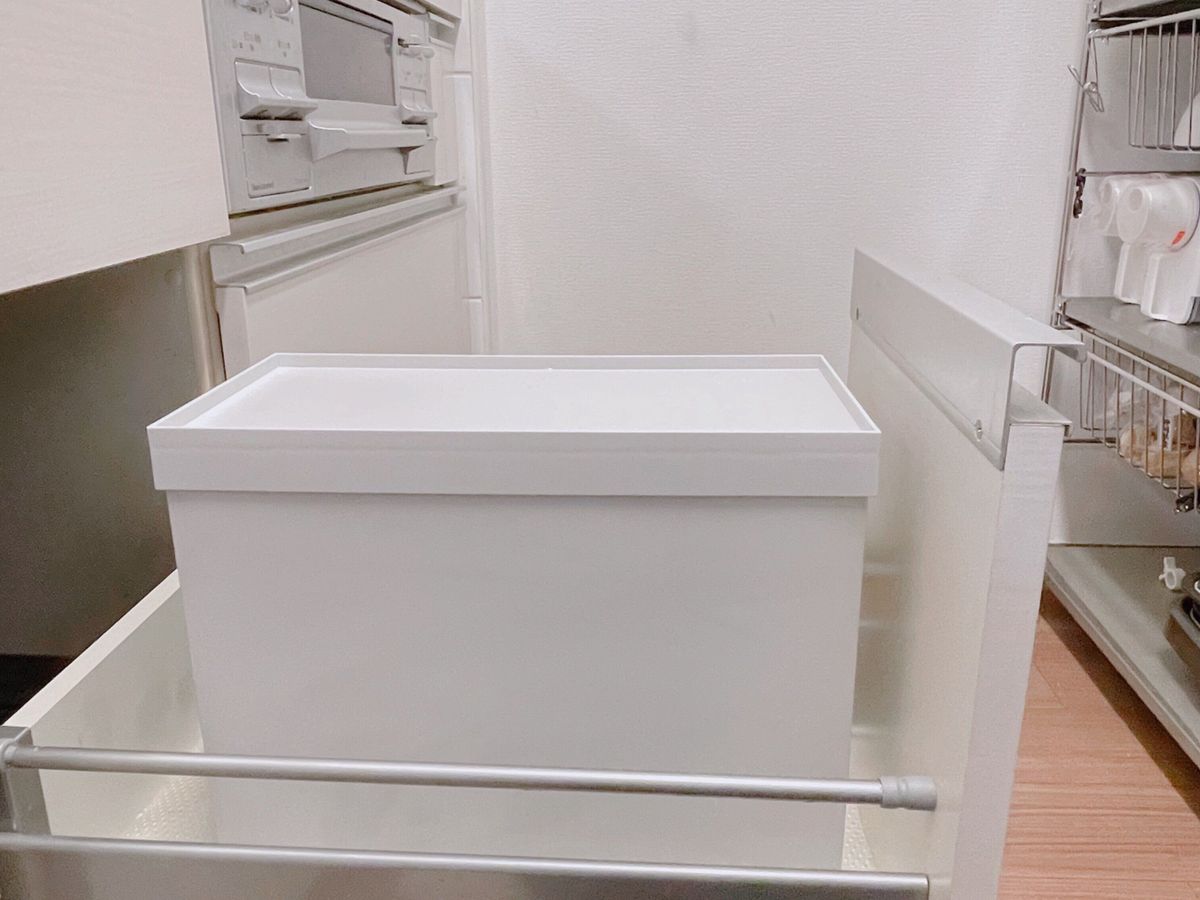キッチンの調理台下にファイルボックスワイドを置き、空き缶用のゴミ箱として使用しています。缶を洗って捨てるものの、虫が寄ってこないか心配な部分もありました。