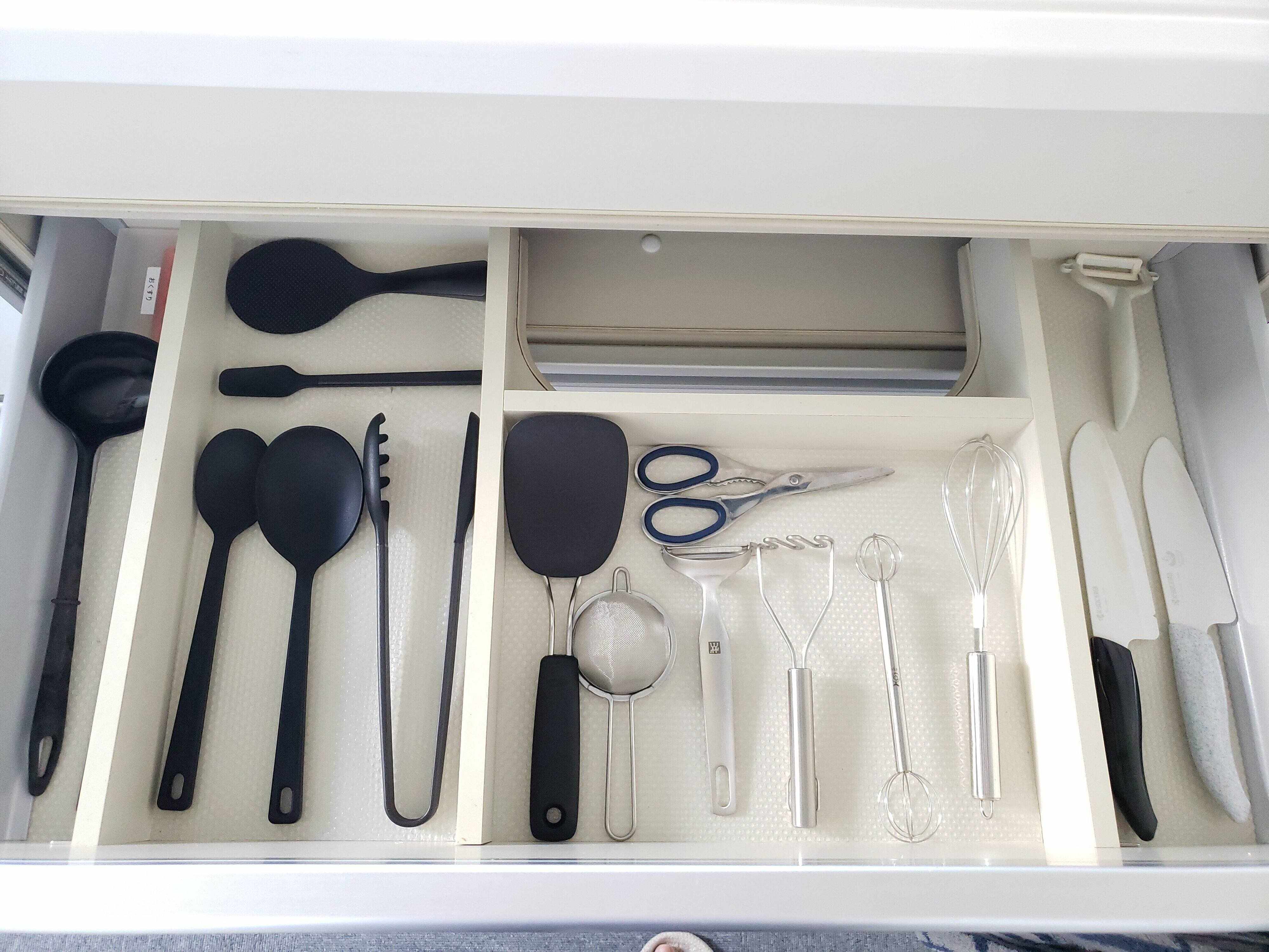 よく使うからこそ出しっぱなしの方がいい!という方もいますが、キッチンツールはどうしてもごちゃついて見えるので、キッチンがスッキリして見えるとは正直私は思えません。