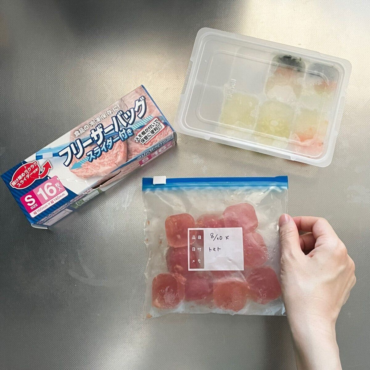 少量の離乳食にちょうどいいサイズのフリーザーバッグ。しかもスライダーつきでしっかり閉じて保存できるので、冷凍庫内もスッキリしました。