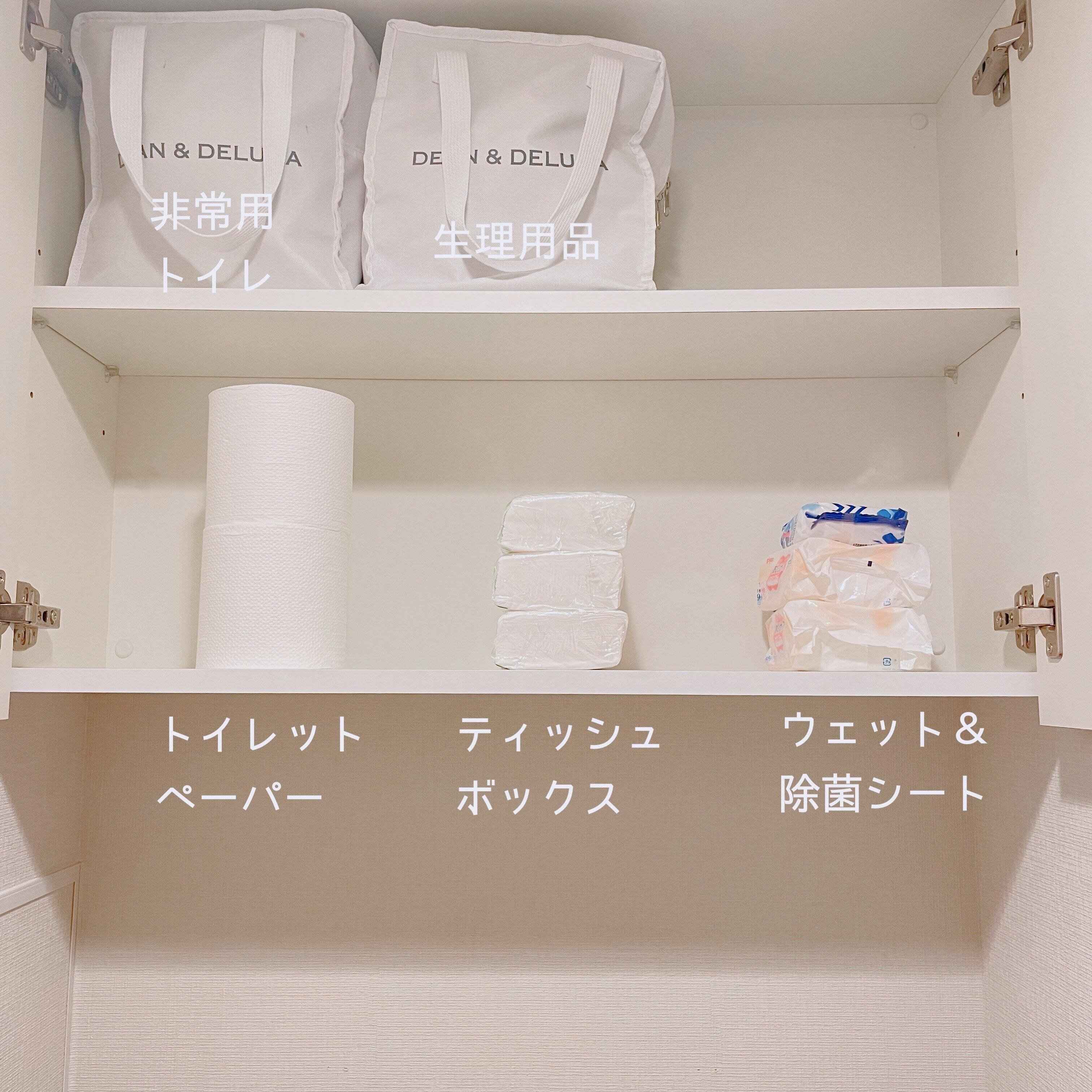例えば、トイレ収納の場合、トイレで使うもの以外にも「ティッシュボックス」や「ウェットシート」などを収納しています。