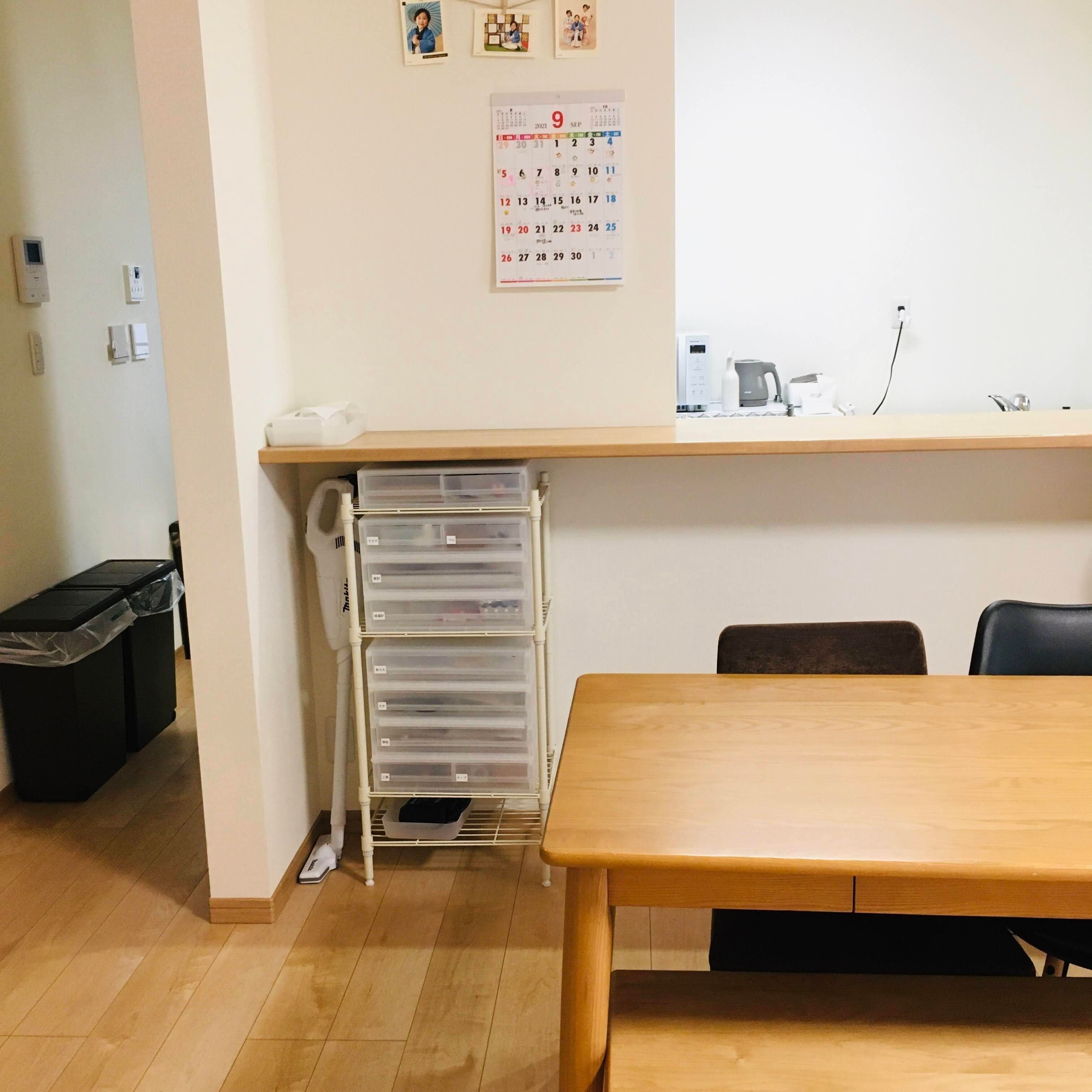 カウンター下によく使うものをまとめて収納しています。リビングの中心ですぐ手に取れる場所なのでとても便利です。