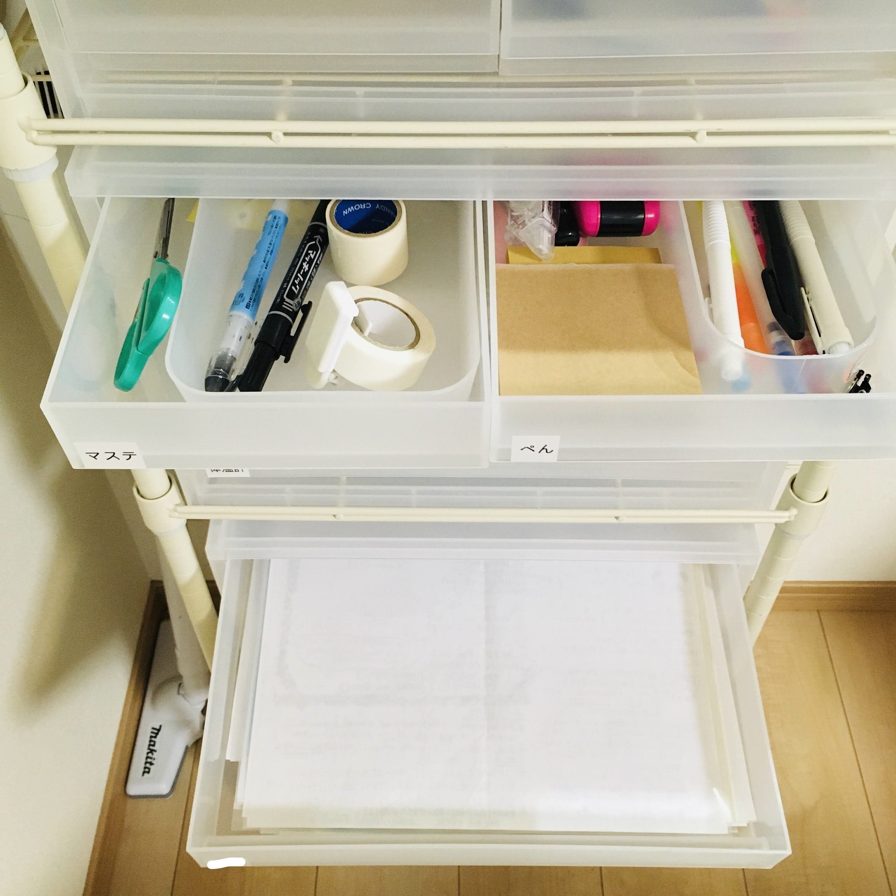 8段の引き出しをグルーピングして分けています。「マステ」には一緒に使うことが多い油性ペンとハサミを、「ぺん」には付せんとメモ帳、修正テープなどを入れています。