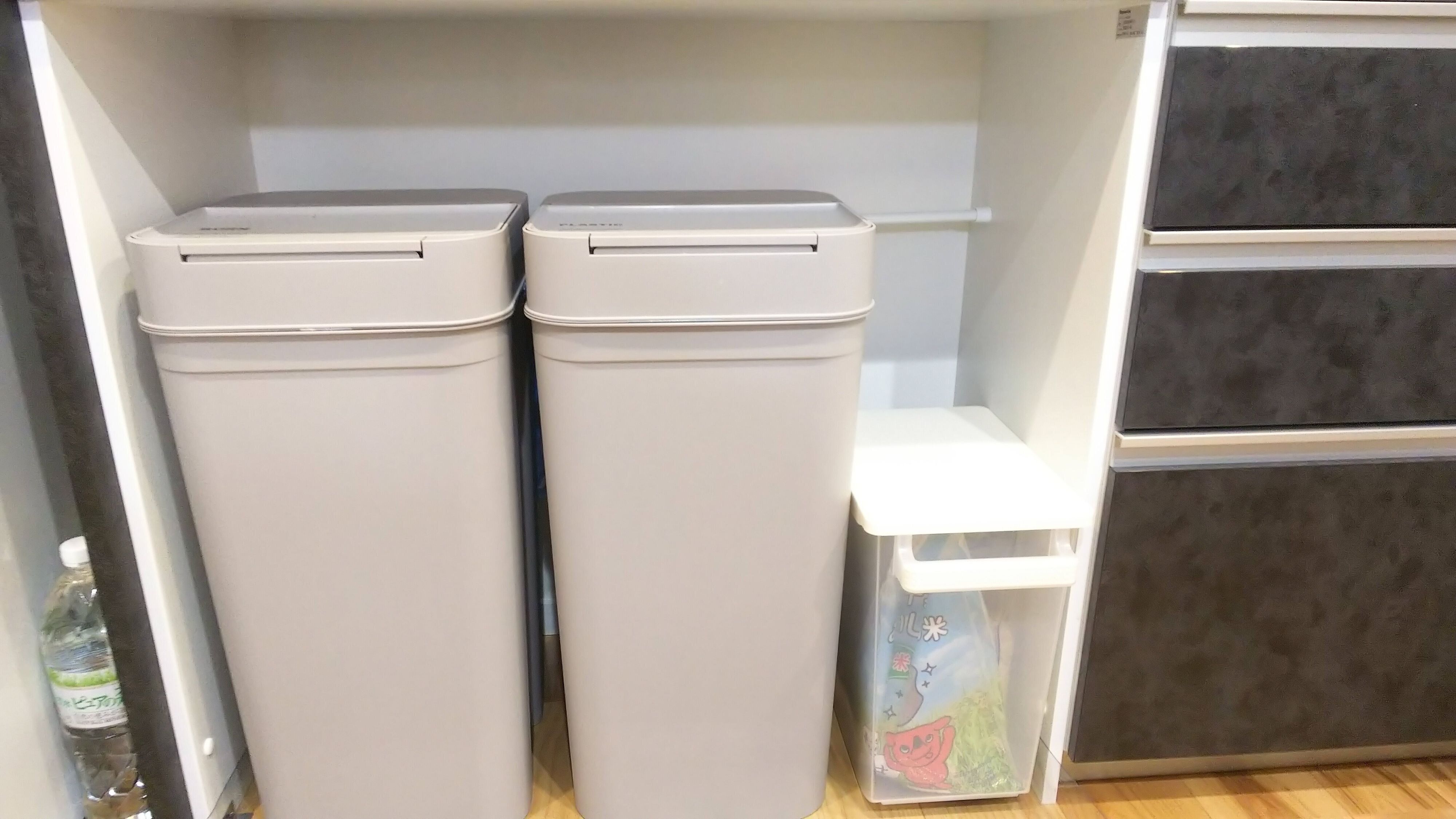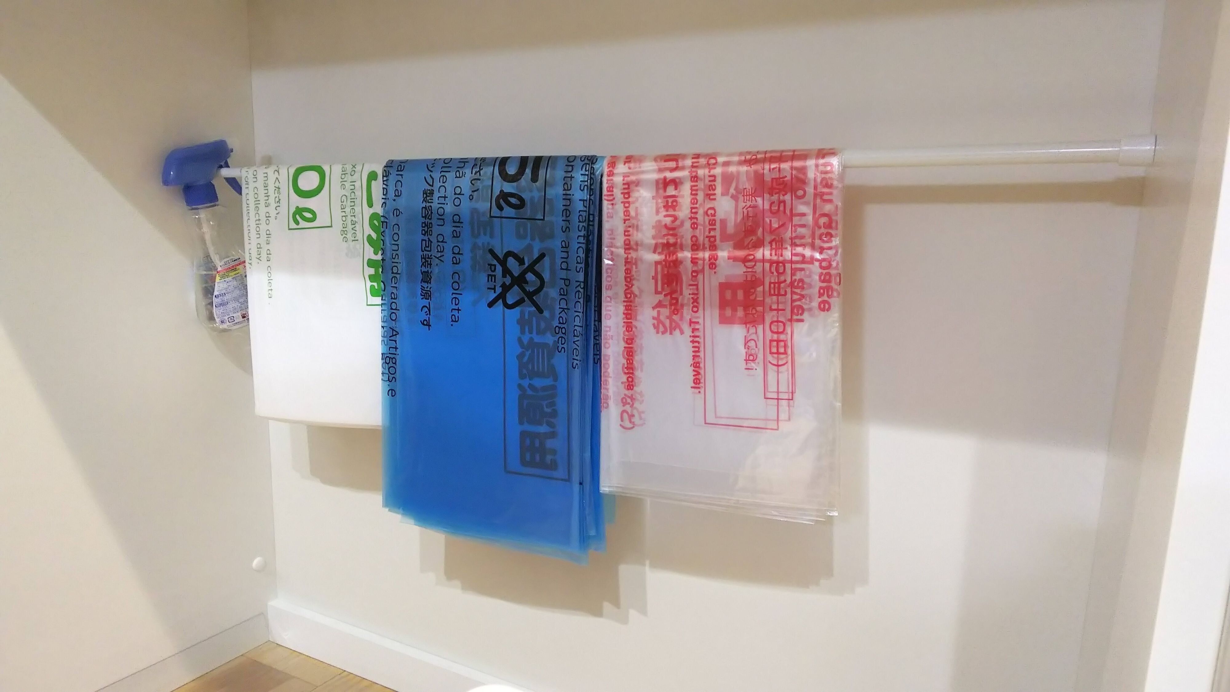 方法としては、ゴミ箱の後ろにつっぱり棒をつっぱり、そこにゴミ袋をかけておくという方法です。可燃ごみのゴミ箱の後ろには可燃ごみのゴミ袋、プラスチック類(資源ごみ)の後ろには、プラスチック類のゴミ袋というようにかけています。こうすることで、ゴミ出しの日に、ゴミ箱を手前に引いて縛ってゴミを出すので、自然と後ろにかかっている新しいゴミ袋を取り出し、設置できるというしくみになっています。
