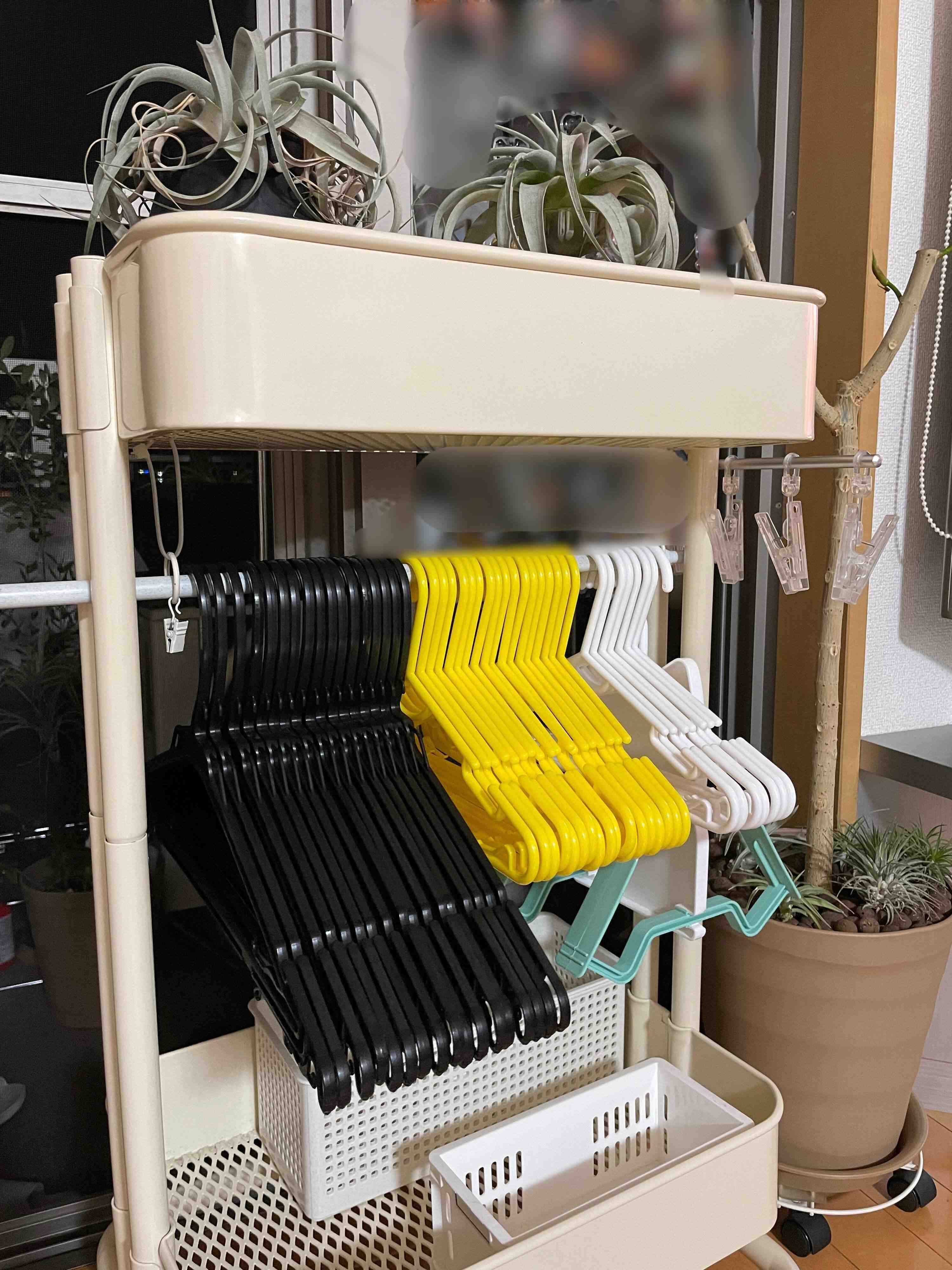 我が家の衣類はハンガー管理を採用しています。ハンガーは洗濯兼用のため回収スポットを作って1ヶ所に集合するようにしています。かけて出しっぱなしを叶えるためにつっぱり棒をプラスし工夫したワゴンはキャスターつきで移動可能なので、掃除の時は寄せたり、みんなで干すときはリビングの真ん中に動かしたりと便利に使っています。