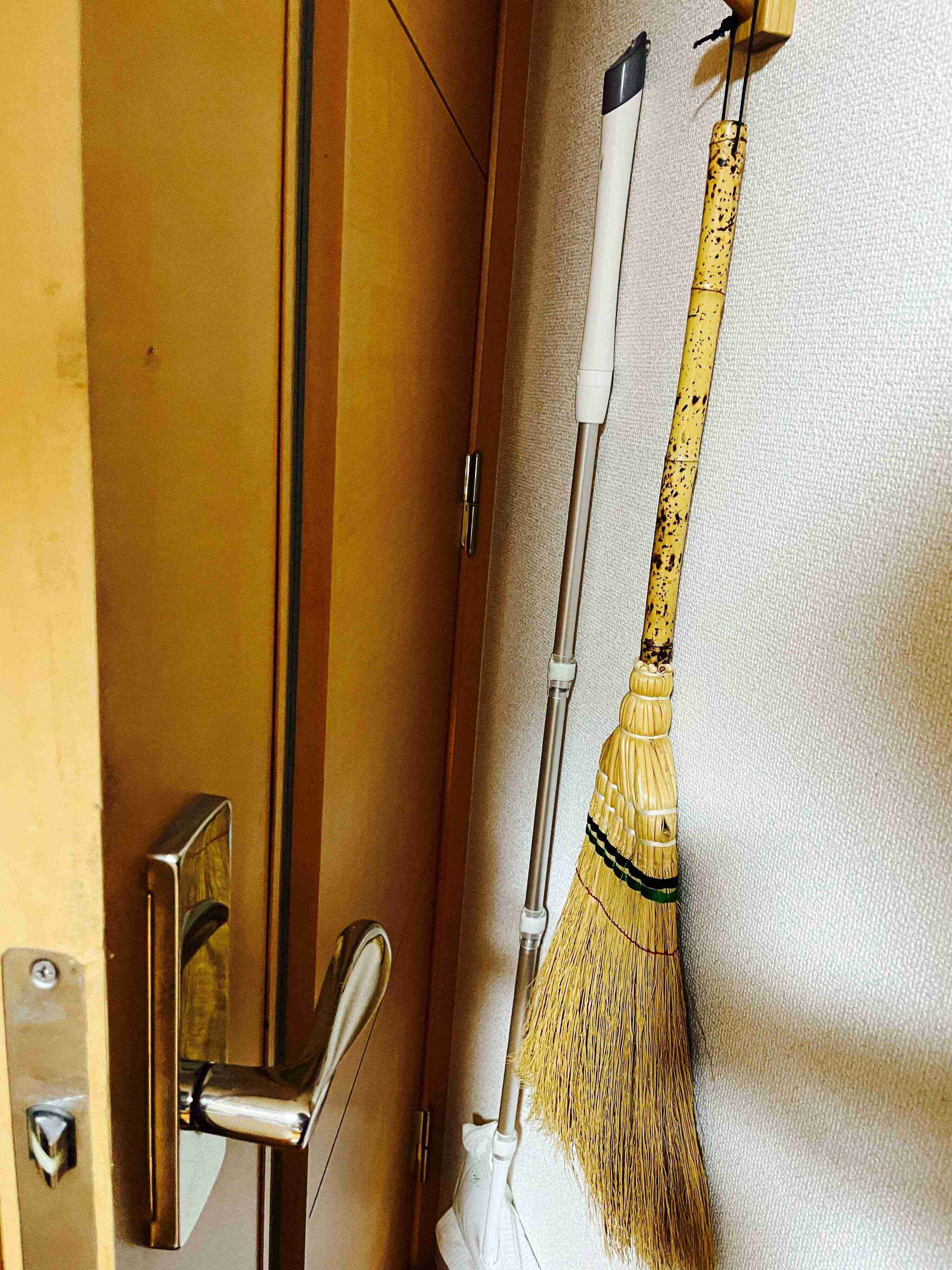 ほうきは、リビングドアと壁の隙間。普段は開けたままのドア、視界に入ることはなく、使いたい時にはドアを閉めればすぐ取れます。お気に入りのほうきなので私は見えていても気分が上がるものです。