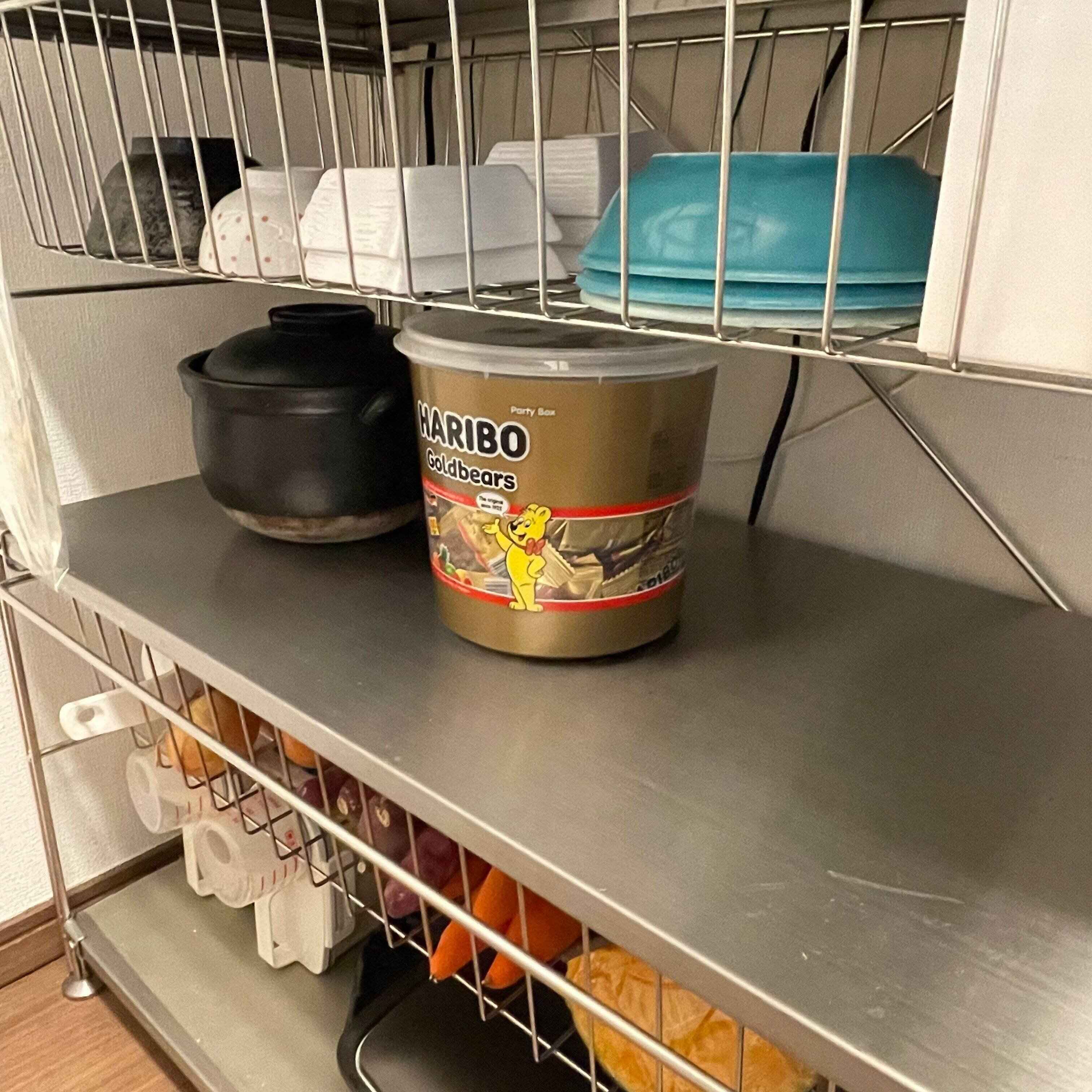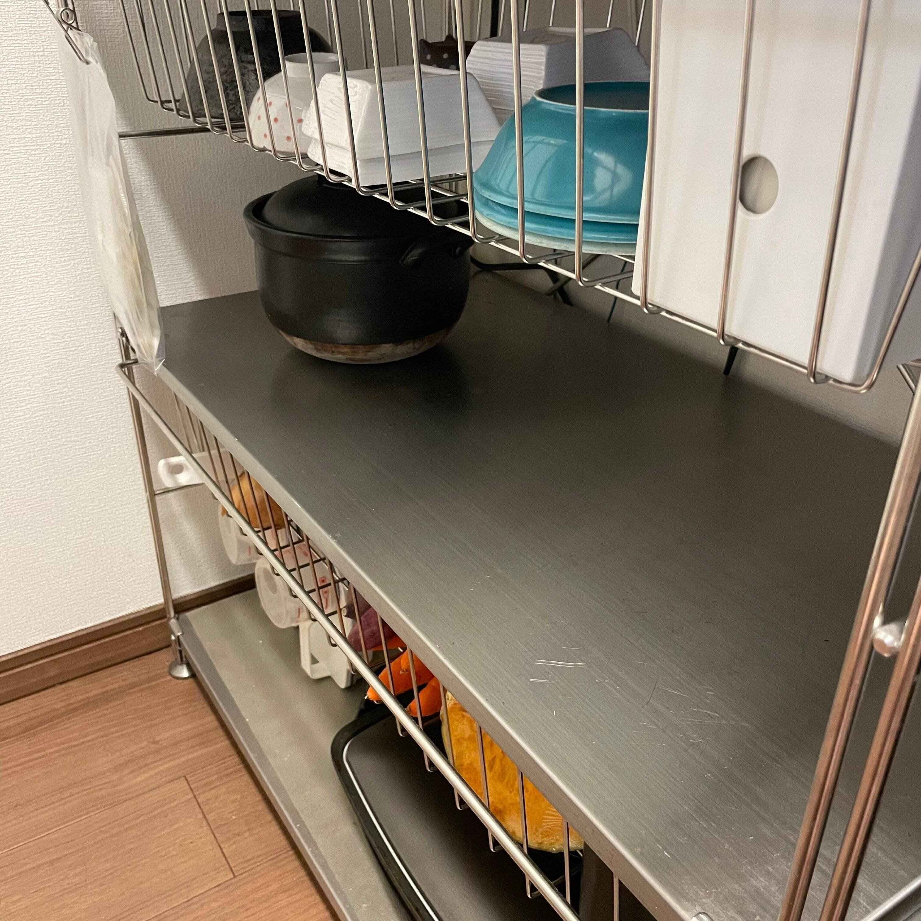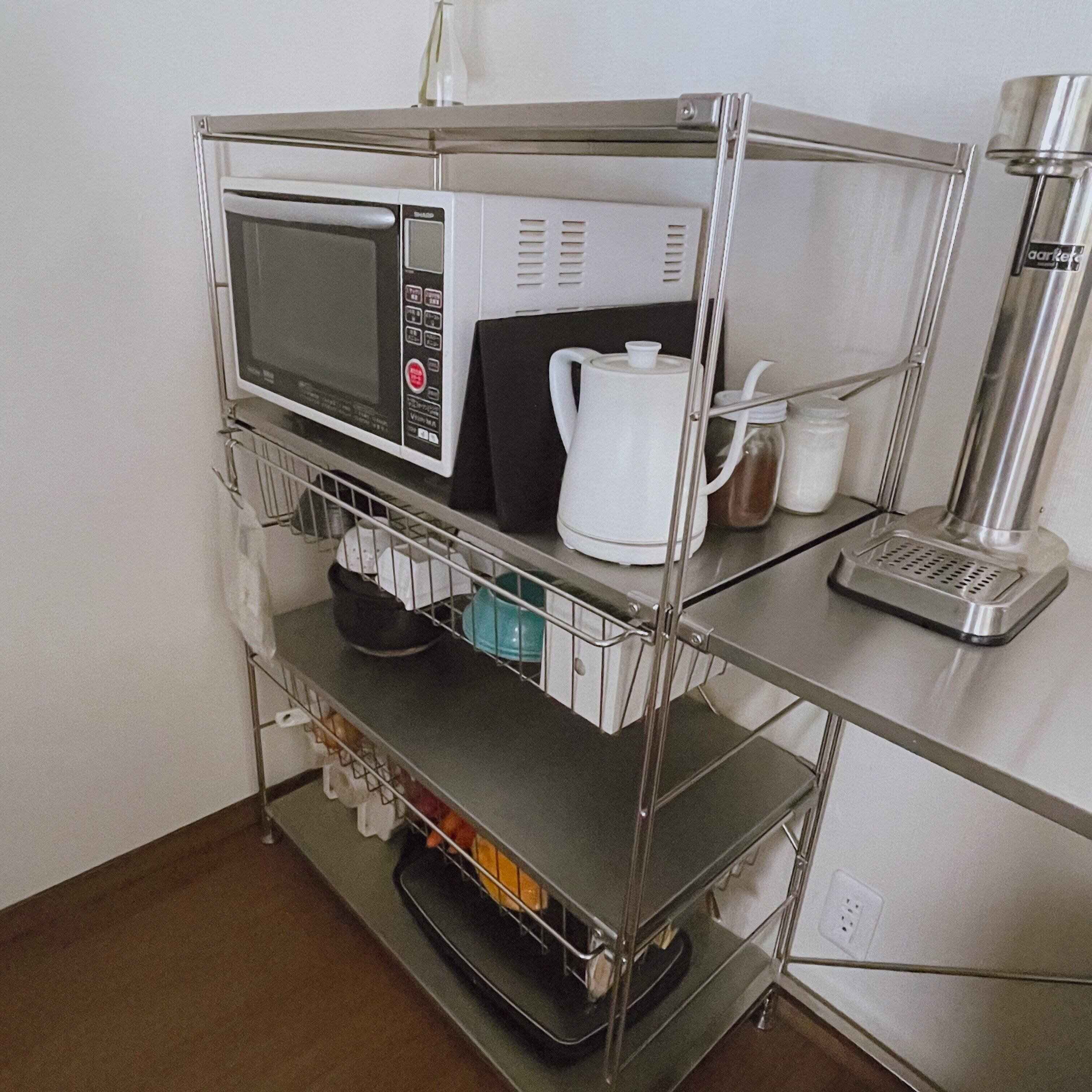 一般的な「食器棚」や「レンジ台」などといわれるものではなく、あえてマルチに使える無印良品のステンレスユニットシェルフを選びました。
