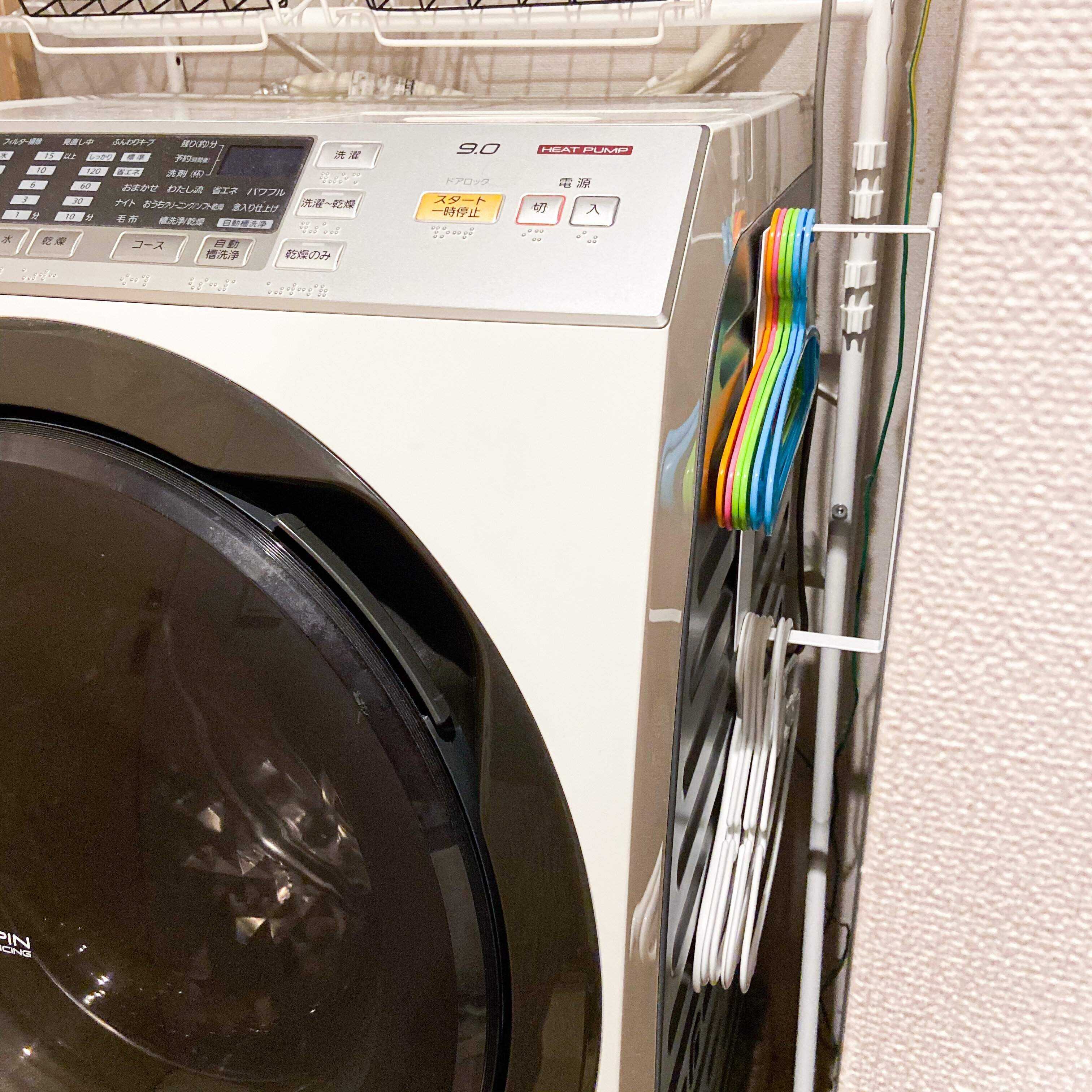 また、マグネットで取りつけることができるハンガーラックを使えば、洗濯機横のこんなに狭い隙間だって収納になっちゃうんです!