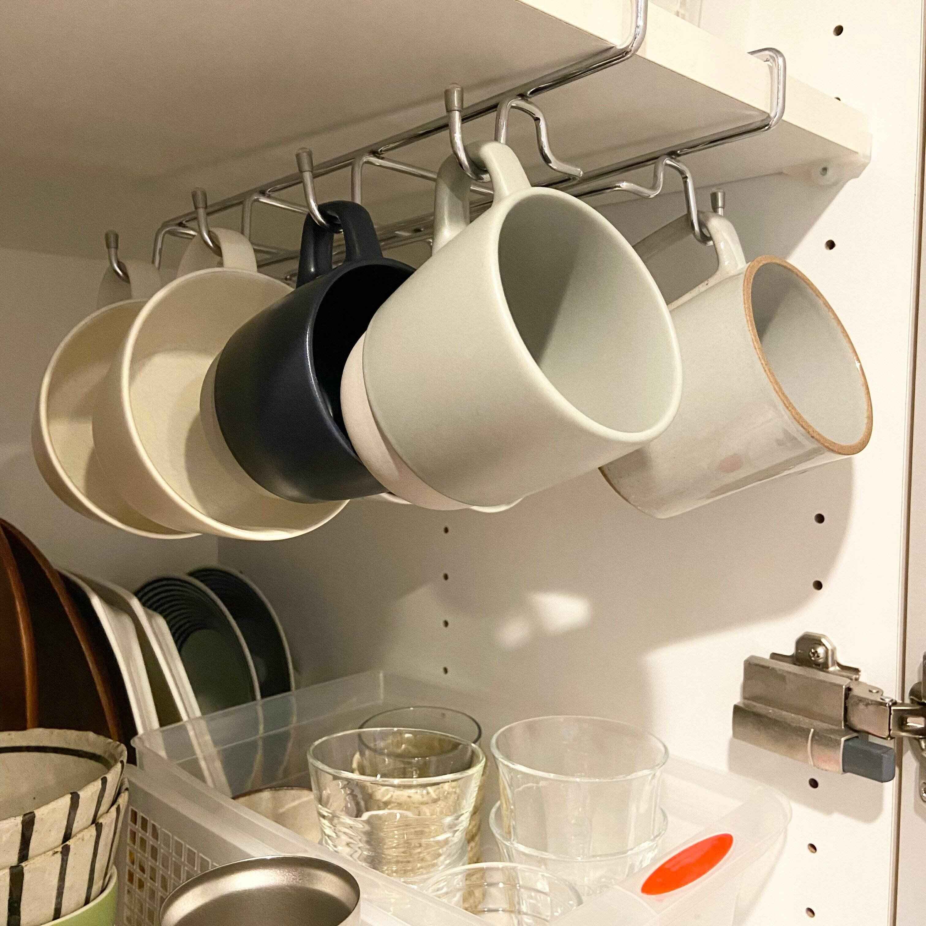 重ねにくいマグカップなどは収納するにも場所をとりがち。吊り下げ収納にすれば、カップハンガーを1つ取りつけるだけで、ティーカップやスープカップなどが計8個も収納できるようになりました。