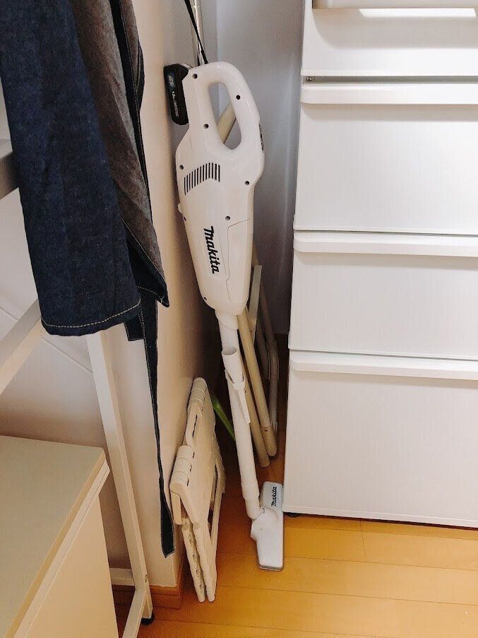 リビングにしまう場所がなくて、やむなく寝室のクローゼットに収納していたんですが、わざわざ上の階まで取りに行き、持って降りて組み立てて、掃除機をかけて、終わったらまた分解して戻す、この一連の流れが本当にめんどくさい!