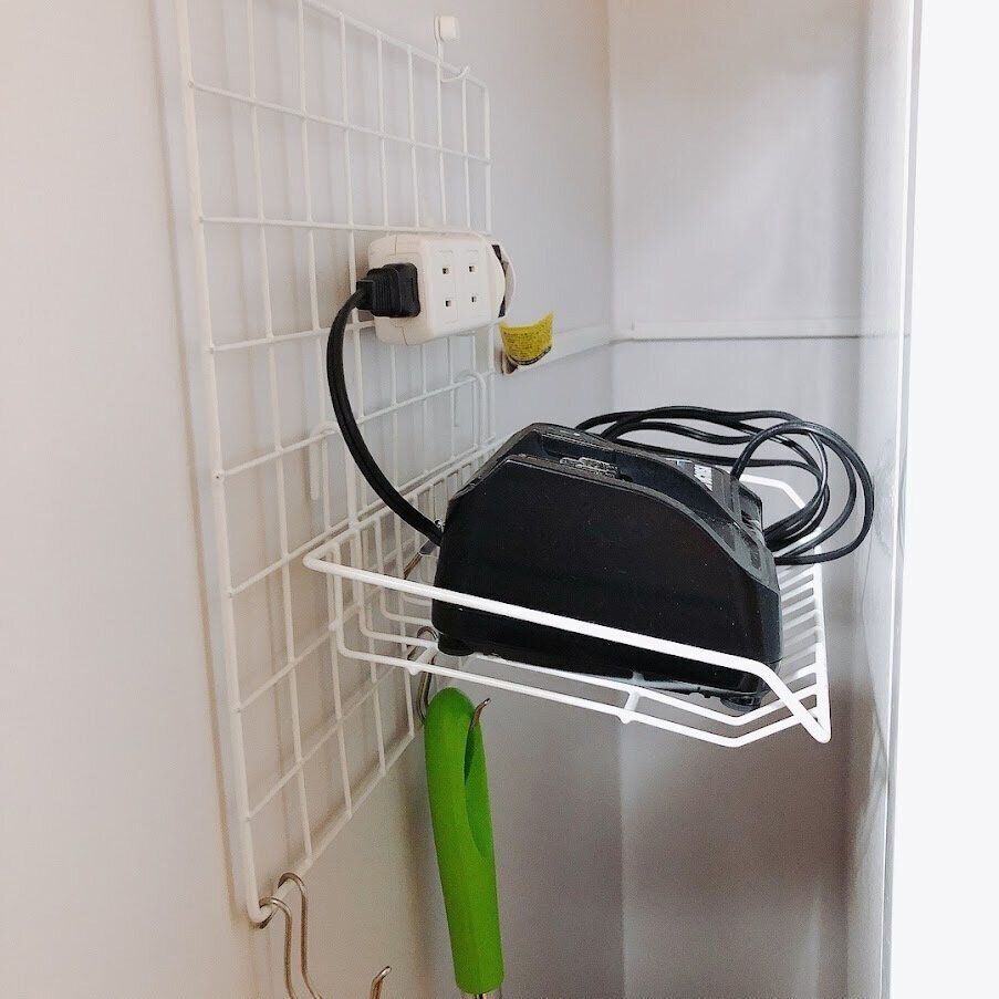 掃除機本体の近くに充電場所もあった方が便利なので、壁にワイヤーネットを取り付けて充電できるようにしました。