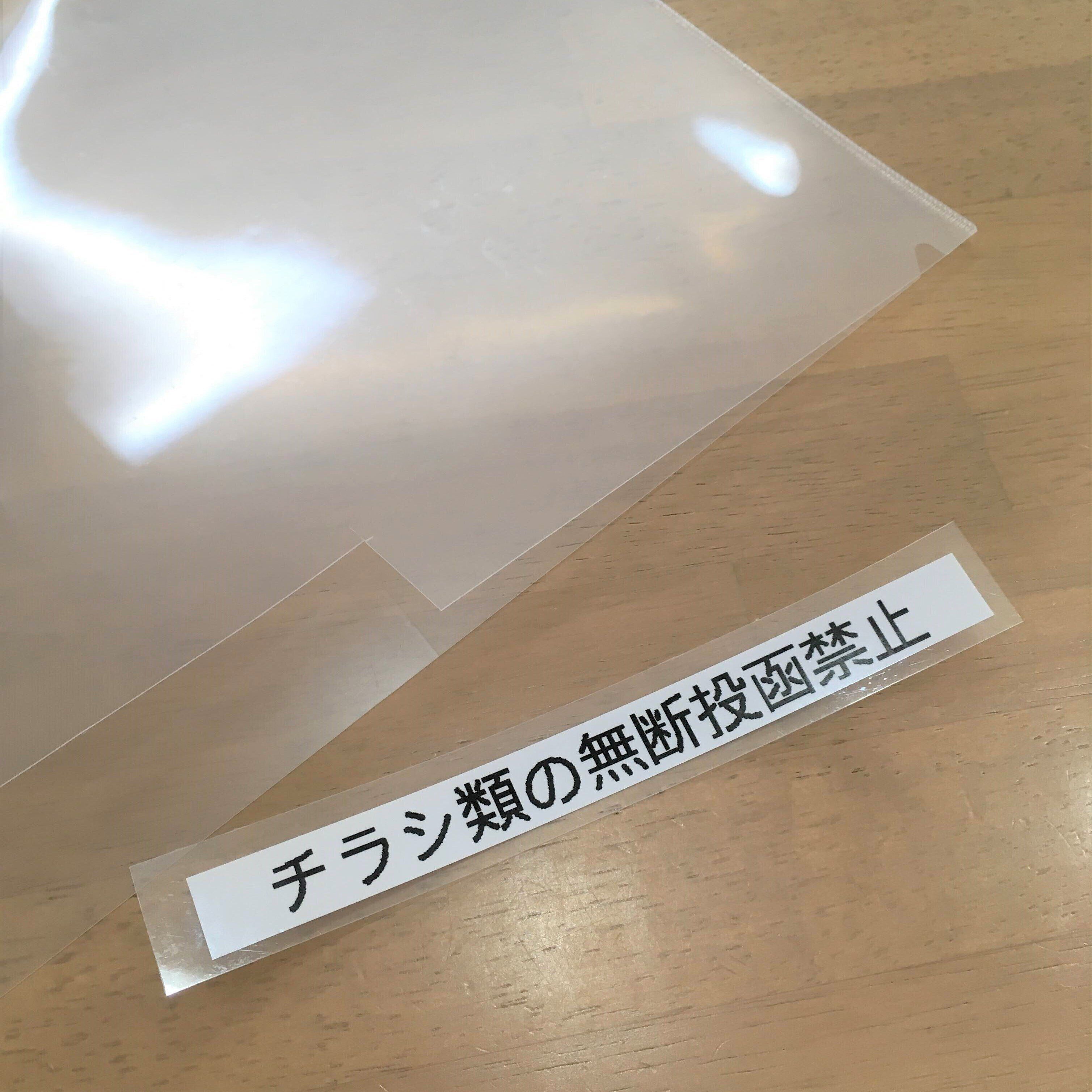 ラベルライターで「チラシ類の無断投函禁止」と印刷し、クリアファイルに貼ります。
