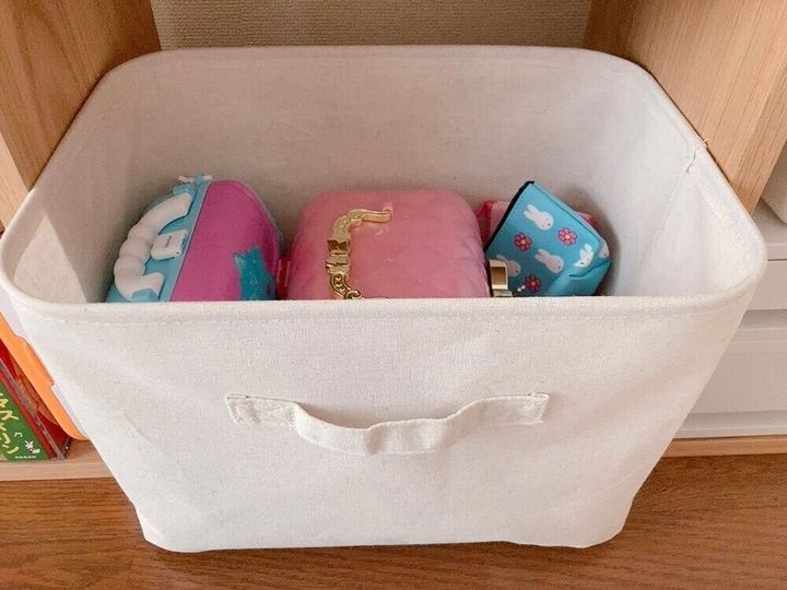 購入時の箱への出し入れやふた付きのボックスでは、お子さんだけで出したりしまったりするのは難しいので、よく使うモノほどポンポン入れられるざっくり収納がおすすめ。