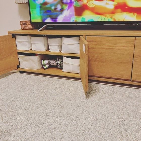 同じくサンキュ!ブロガーシノザキマミさんのお子さんの衣服やオムツ類はすべてTVボードにイン!「この空間にすべて子供の物は入っている」と分かれば、細かい仕訳は分からなくても「とりあえずこの空間にいれておけばいい」と家族が共通認識になりますので、家族も片付けがしやすくなりますね。