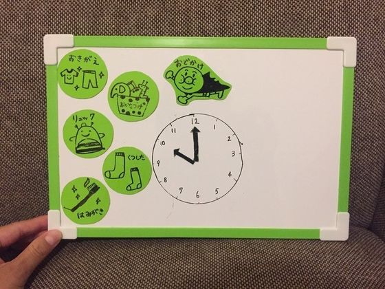 これならまだ文字が読めないお子さんもすんなり理解ができだし、「今はこれをする時間なんだよ」と時計の読み方も併せて教えることができるので、一石二鳥なアイディアです。