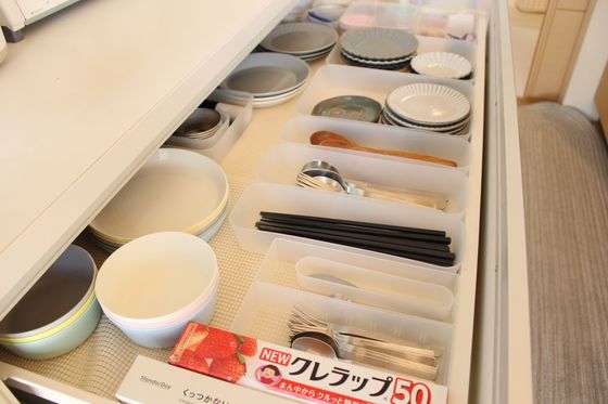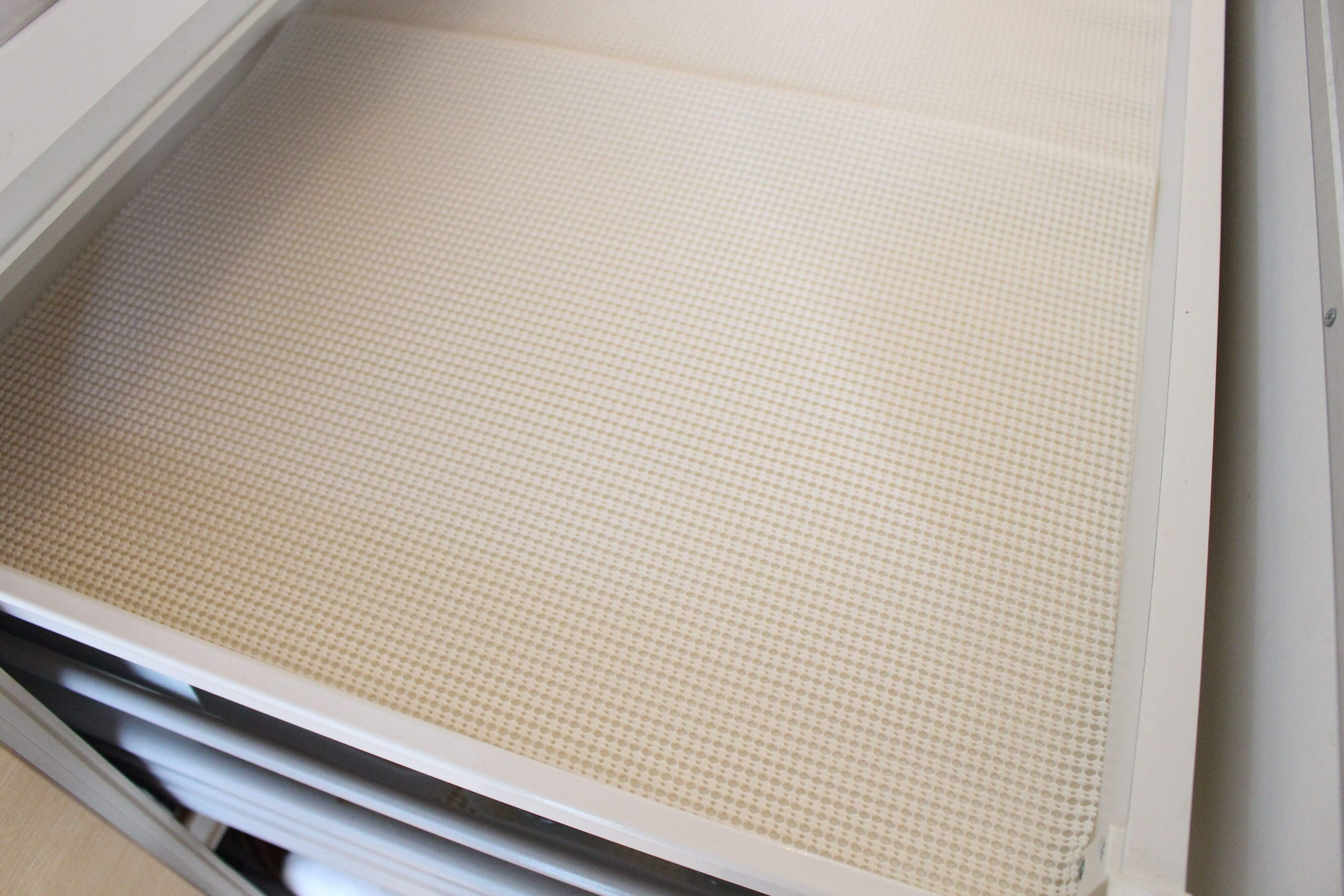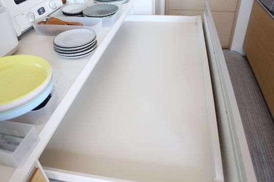 滑り止めのおかげで、カトラリーのケースや食器がズレることなく開け閉めができるので、これはキッチンの引き出し収納の必需品です。