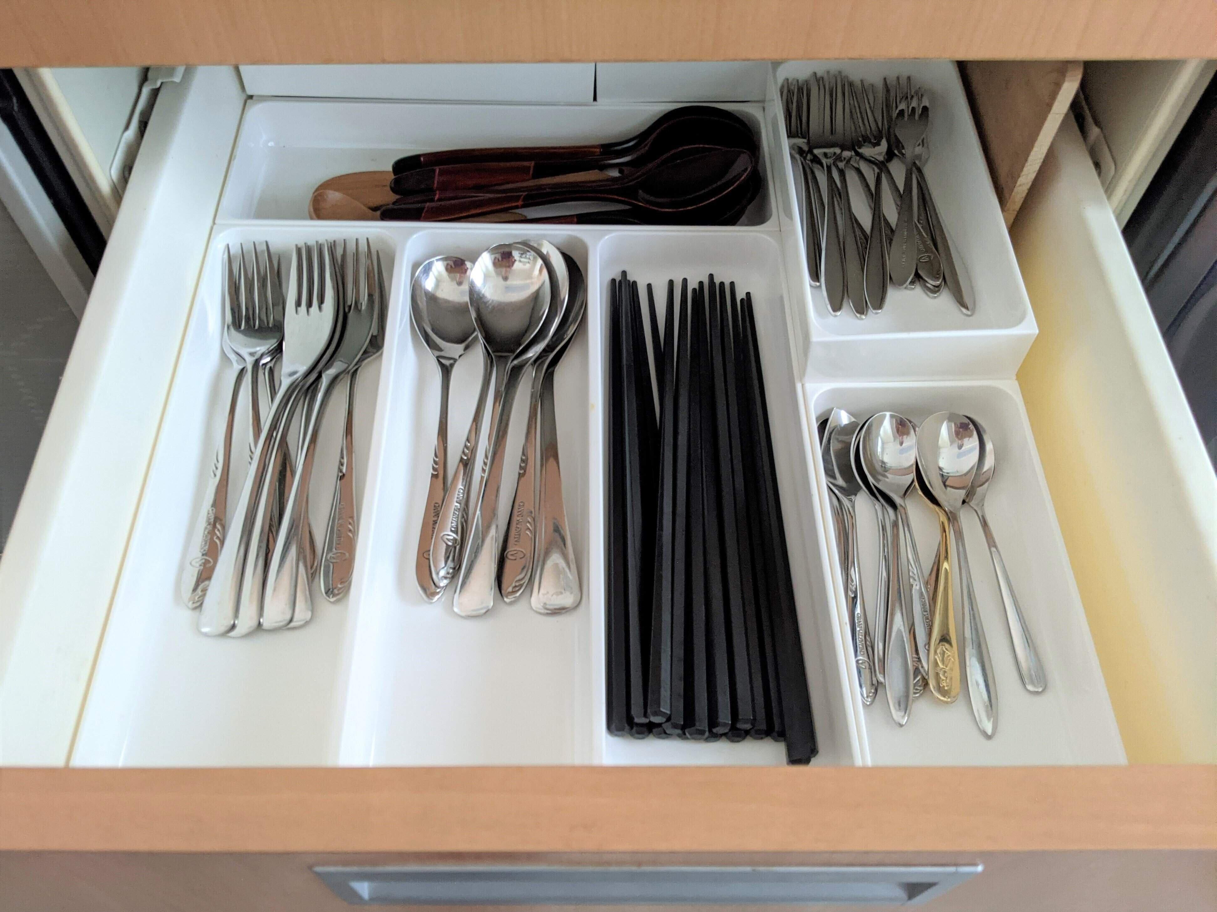 簡単に出し入れができるよう、引出し1段、収納ボックス1つ、カトラリーケース内の1スペースにつき、1ジャンルのモノを入れる方法がおススメです。