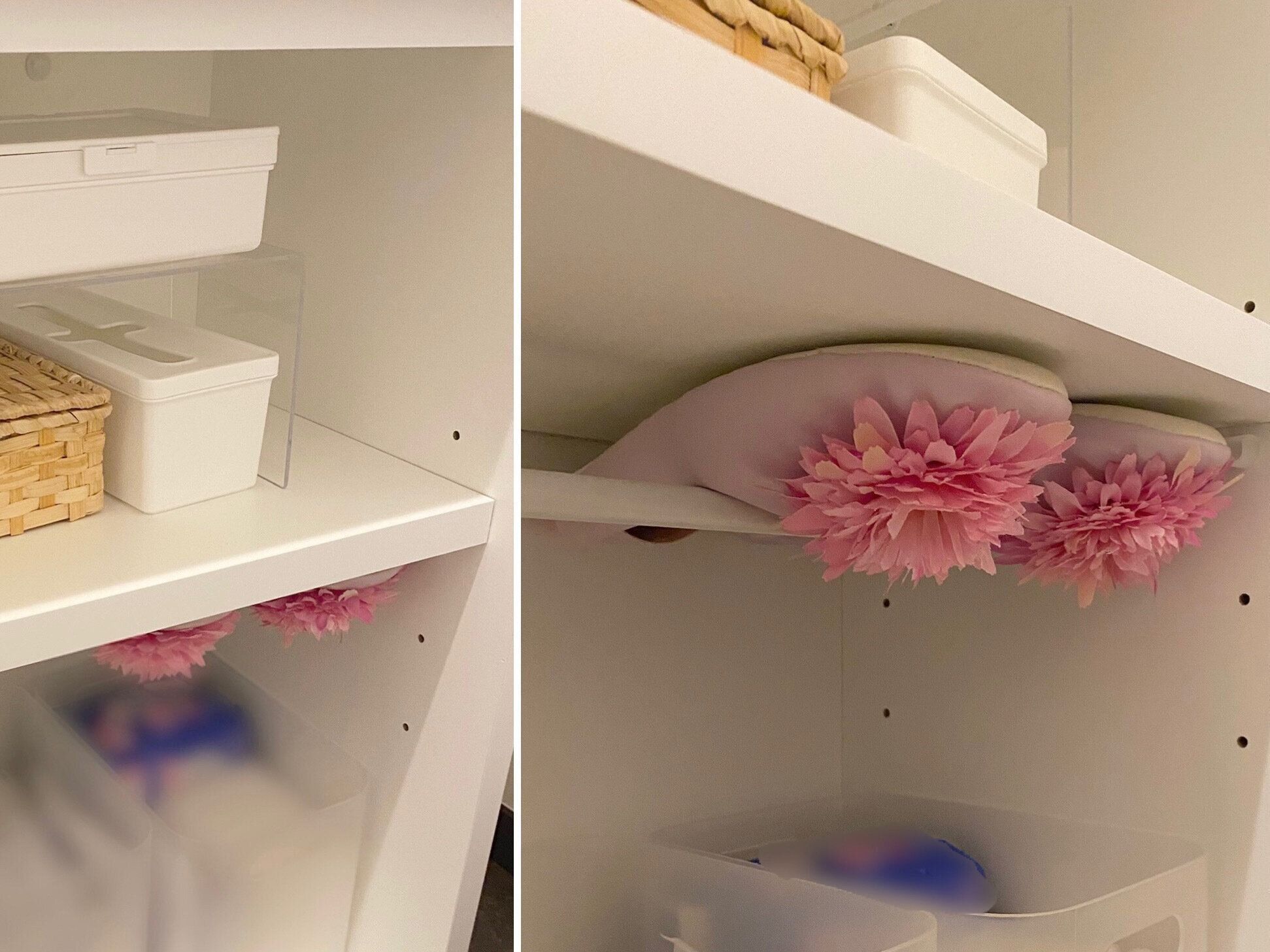 来客時はお客様用のスリッパを出していますが、すぐ準備できるようにトイレ内の収納に置いています。