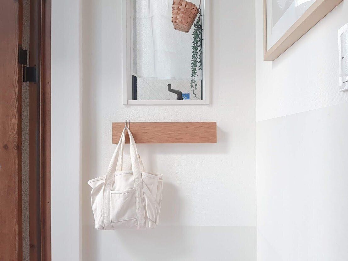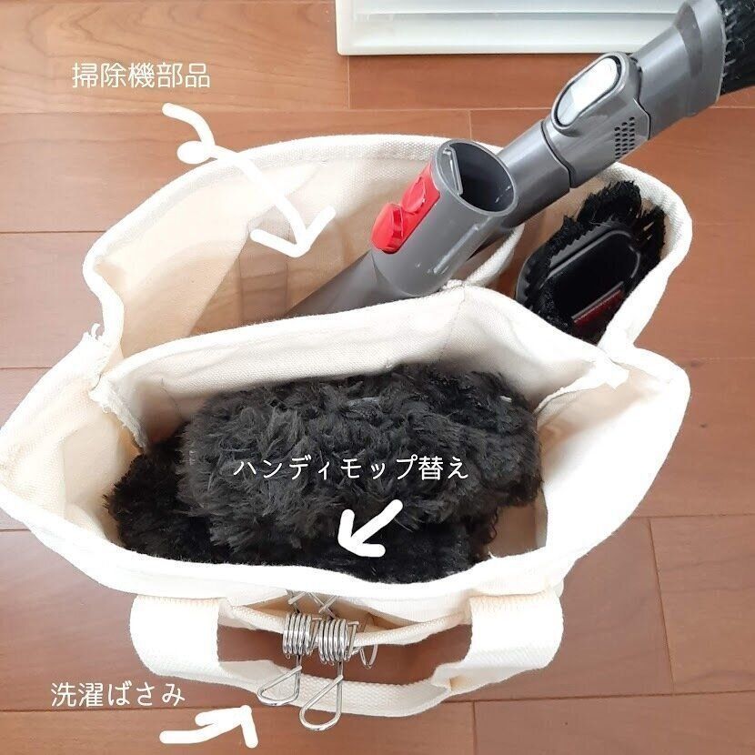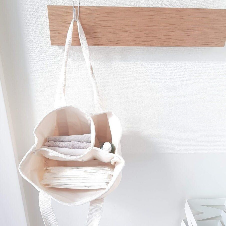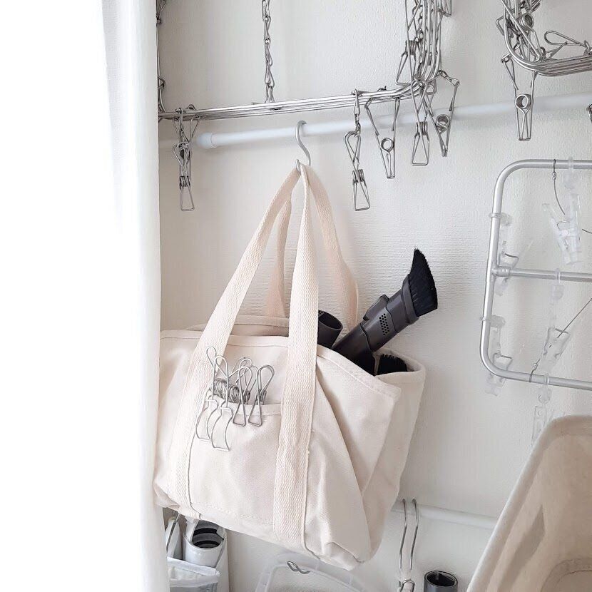 こちらのトートバッグは、収納スペースの少ない我が家が活用している壁面収納にピッタリ!突っ張り棒にS字フックをつけて、掃除機のヘッドや、モップの替えを収納しています。