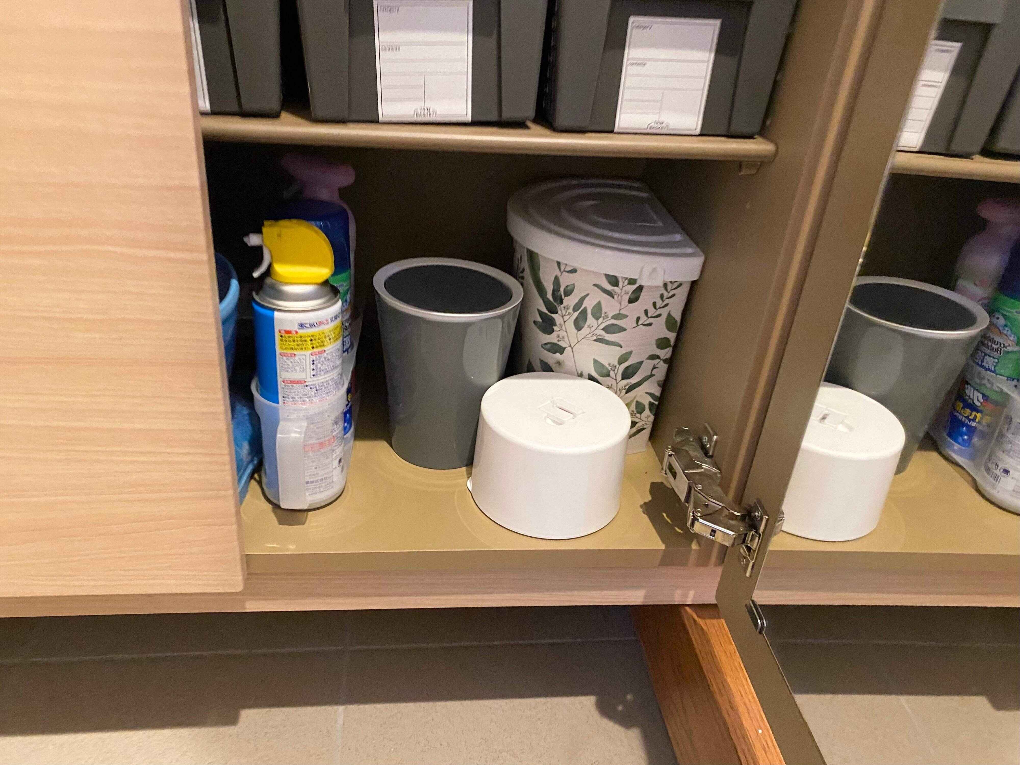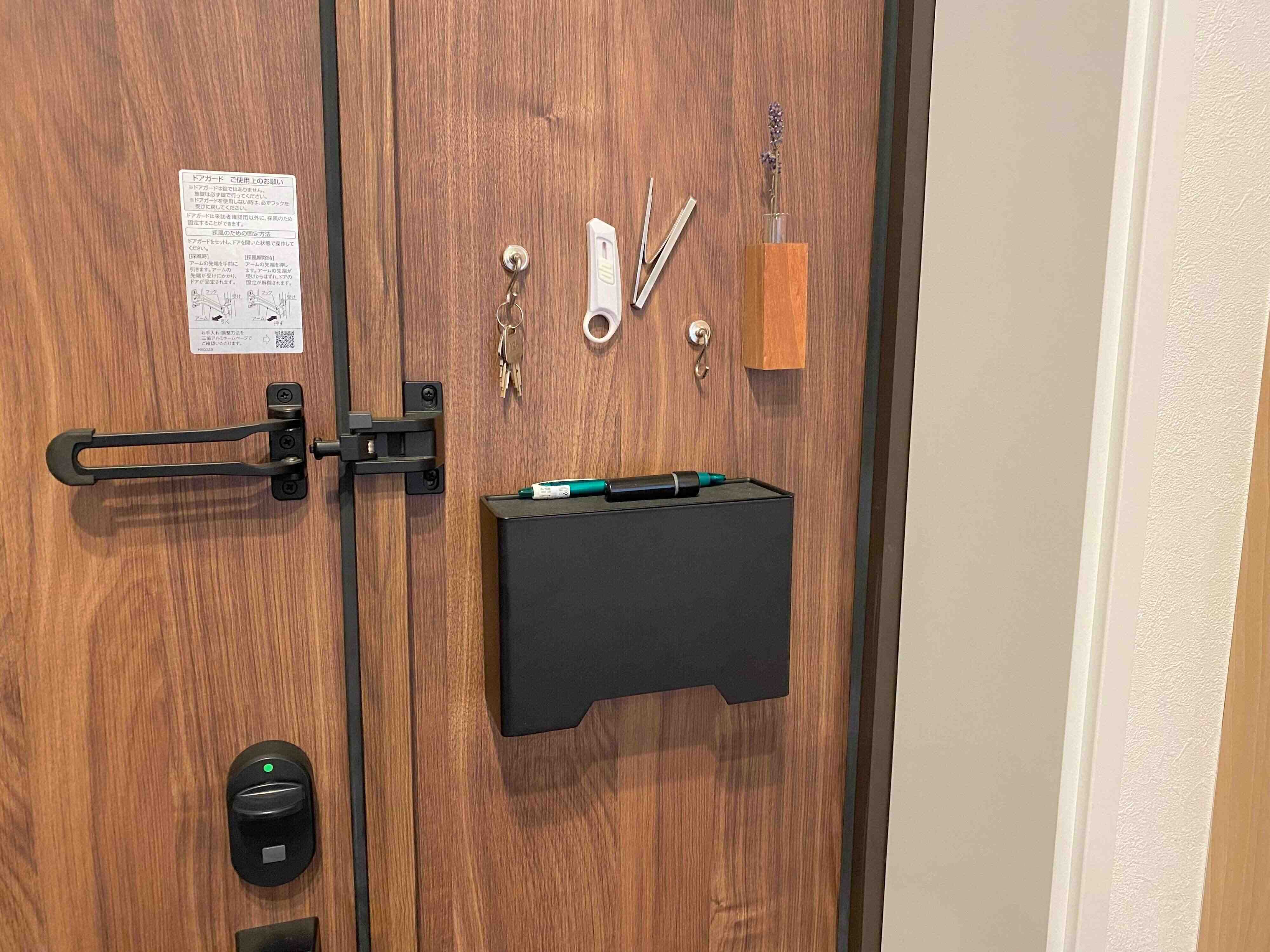 これら動作がスムーズに行えるように、玄関ドアにペーパーカッターをマグネットで貼りつけて、下駄箱の中にはゴミ箱・ビニール紐を置いています。