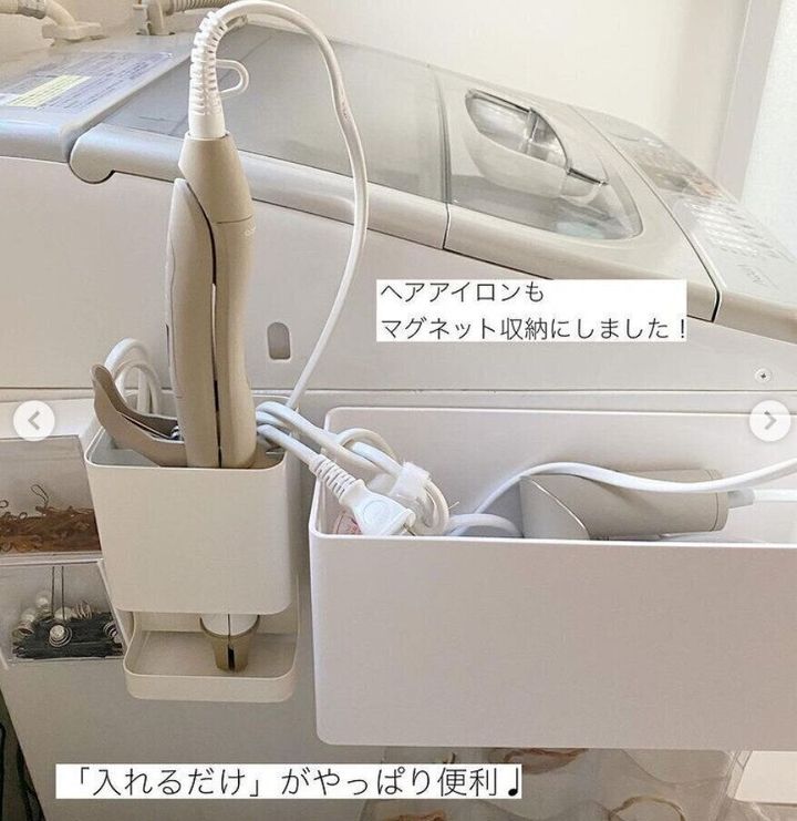 洗濯機横の空きスペースは、マグネット収納が大活躍!ヘアアイロンやドライヤーをすっぽり収納できるケースを使えば、このように『入れるだけ』の便利で楽ちんな収納が完成しますよ。収納ケースを洗濯機の色に合わせると、よりナチュラルにお部屋に馴染みます。