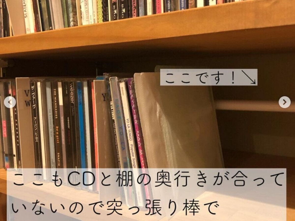 CDを収納したいのに、棚の奥行きがぴったり合っていないときは、突っ張り棒を使って調整するとストレスフリーに!CDの出し入れがしやすくなり、見た目もきれいに整います。さまざまな場所に活用できそうな素敵なアイデアです。