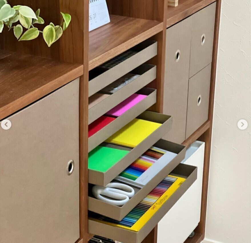 スタッキングシェルフに、ペーパープロダクトブランド、andpapersの引き出しを取りつけた素敵なアイデアです!こまかな書類や小物などを仕分けながら入れられるのがうれしいところ。浅型で中身が見えやすく、引きで見ると中身が目立たないという使い勝手のよさです!