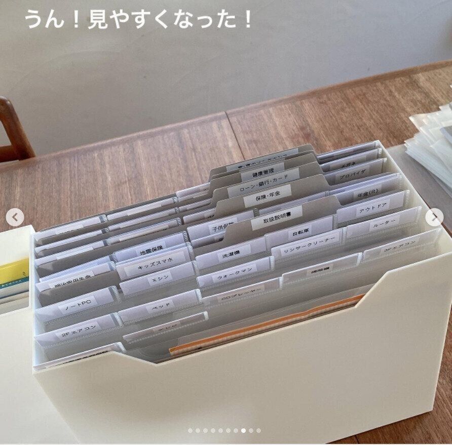 インデックス部分が重なって見えにくい、探しにくいというプチストレスを解消するため、書類収納をアップデート!書類が項目別に見えやすいように、インデックスつきクリアホルダーでこまかくラベリングしています。入れ替えながら書類の整理もでき、使い勝手もいいという素敵なアイデアです。