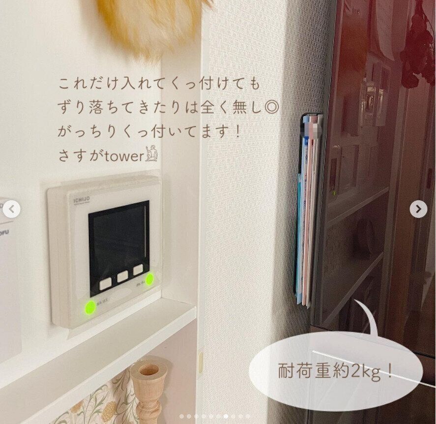 スタイリッシュなデザインも人気の、towerのレシピブックラックを活用したアイデア。冷蔵庫のサイドの空きスペースにぴったりおさまり、これだけ書類を入れてもずり落ちてこない安定感があります。書類の出し入れもしやすく、生活感が出ないのもうれしいポイントです。
