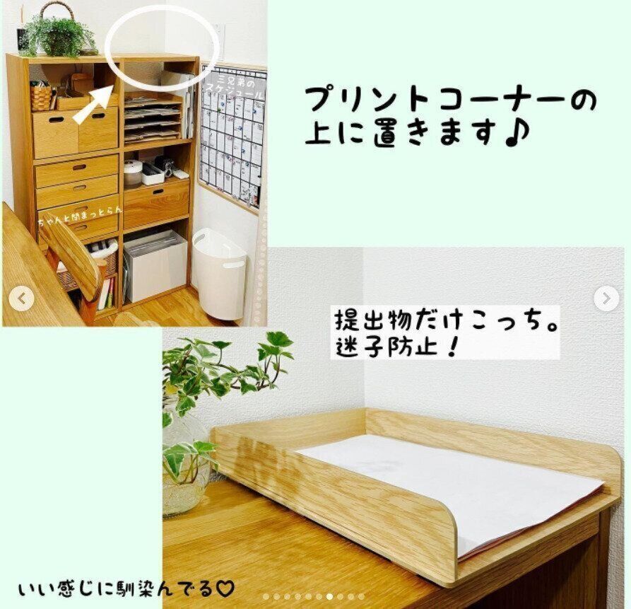 ほかのプリントに紛れて提出物を忘れないよう、ダイソーの組立式トレーに分けて管理するという素敵なアイデアです。トレーはダイソーの220円商品で、インテリアになじむおしゃれなデザインも魅力的。組み立ても簡単で、このようにいつも見える場所に置くことで忘れ物の防止にも繋がりそうです。