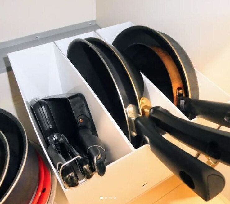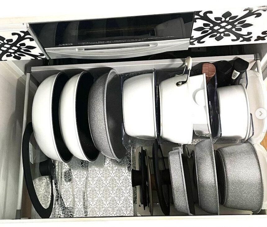 こちらは、仕切りを活用してフライパン収納をされています。仕切りを動かすのは自由自在なので、収納したいフライパンのサイズに合わせて調整できるのがうれしいですね。スペースを無駄なく活用できますね。立てて収納するため、パッと見てどこに何を収めたのか分かりやすいのも使いやすいポイントです。