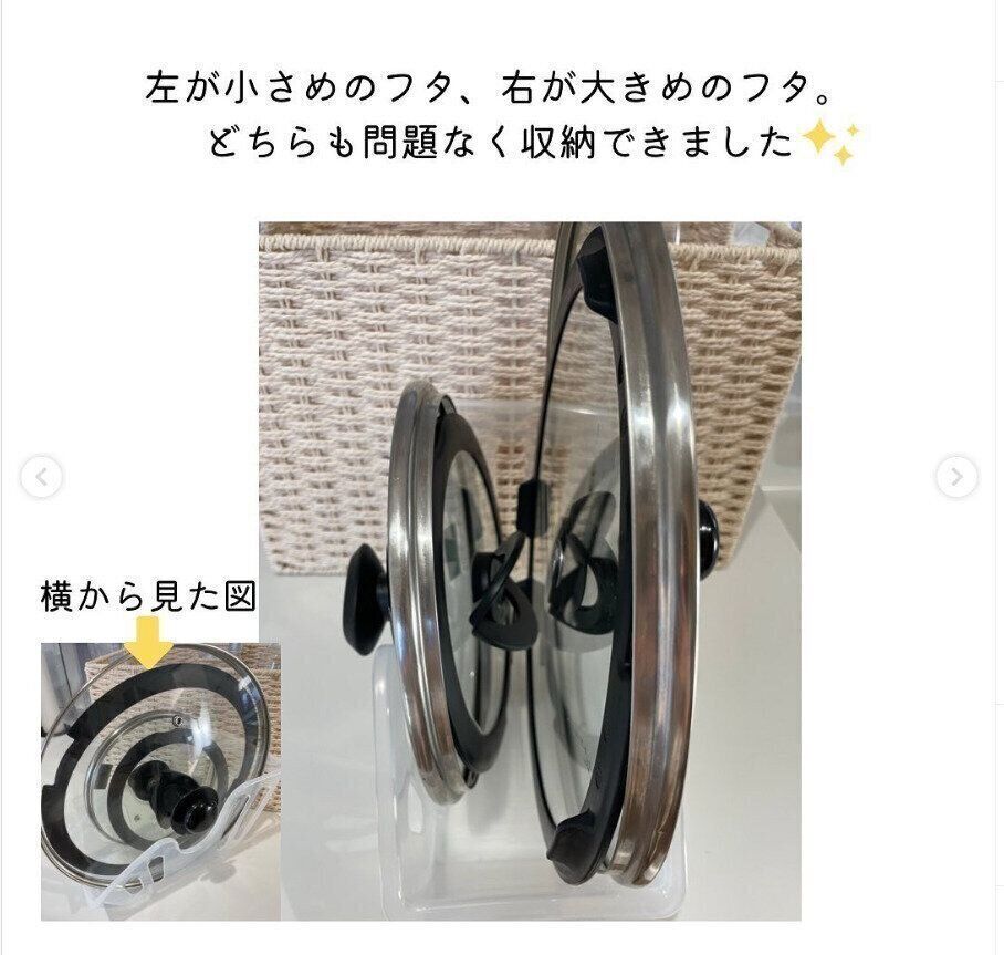 セリアのなべフタスタンドは、便利な仕切りつきでフライパンや鍋のフタを立てて収納しても倒れにくいのがポイント。フタ部分はサイドのくぼみにおさまるので、引っかからずスッキリ収納できます。スタンドの前部分も高さがあるので転がりにくく、プチストレスを軽減してくれますよ。