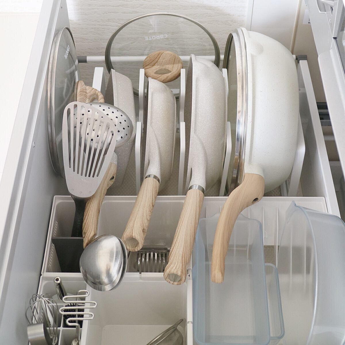 ニトリのフライパンスタンドを活用した素敵な収納アイデアです!立てる収納でどこに何があるかわかりやすく、大きさの違うアイテムもまとめて収納できるのがうれしいところ。引き出し内にほどよいゆとりがあるので、サッと出し入れもしやすそうです。